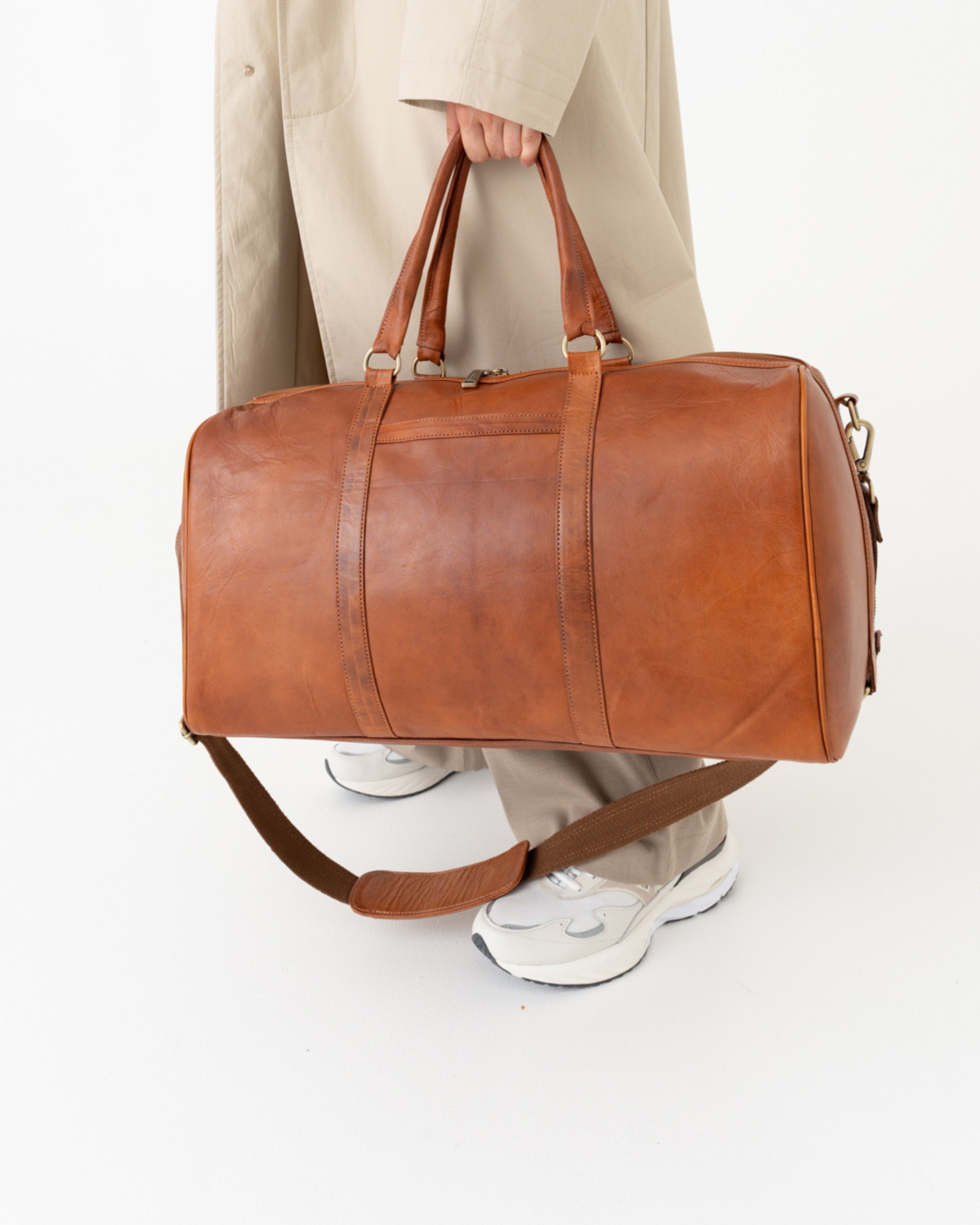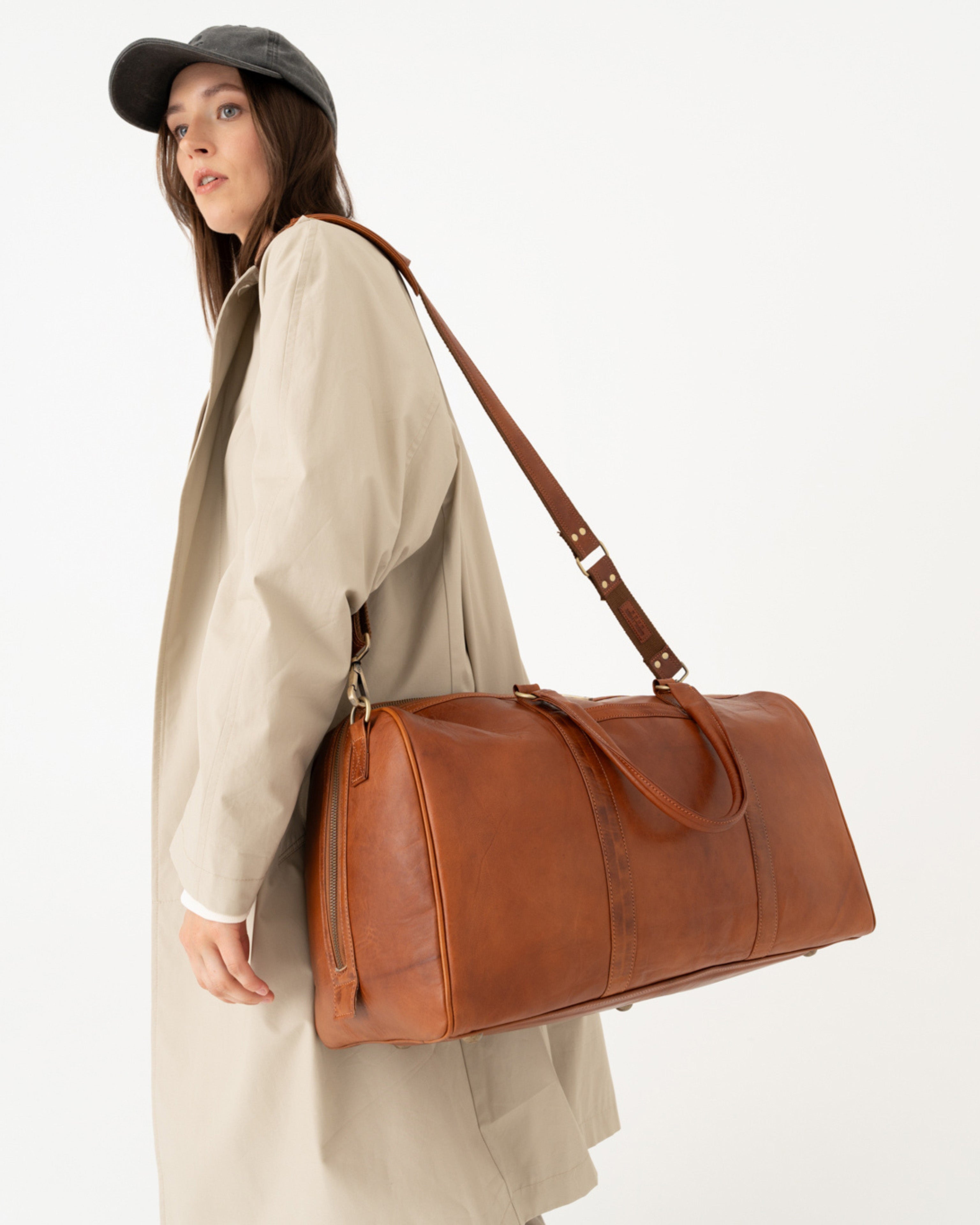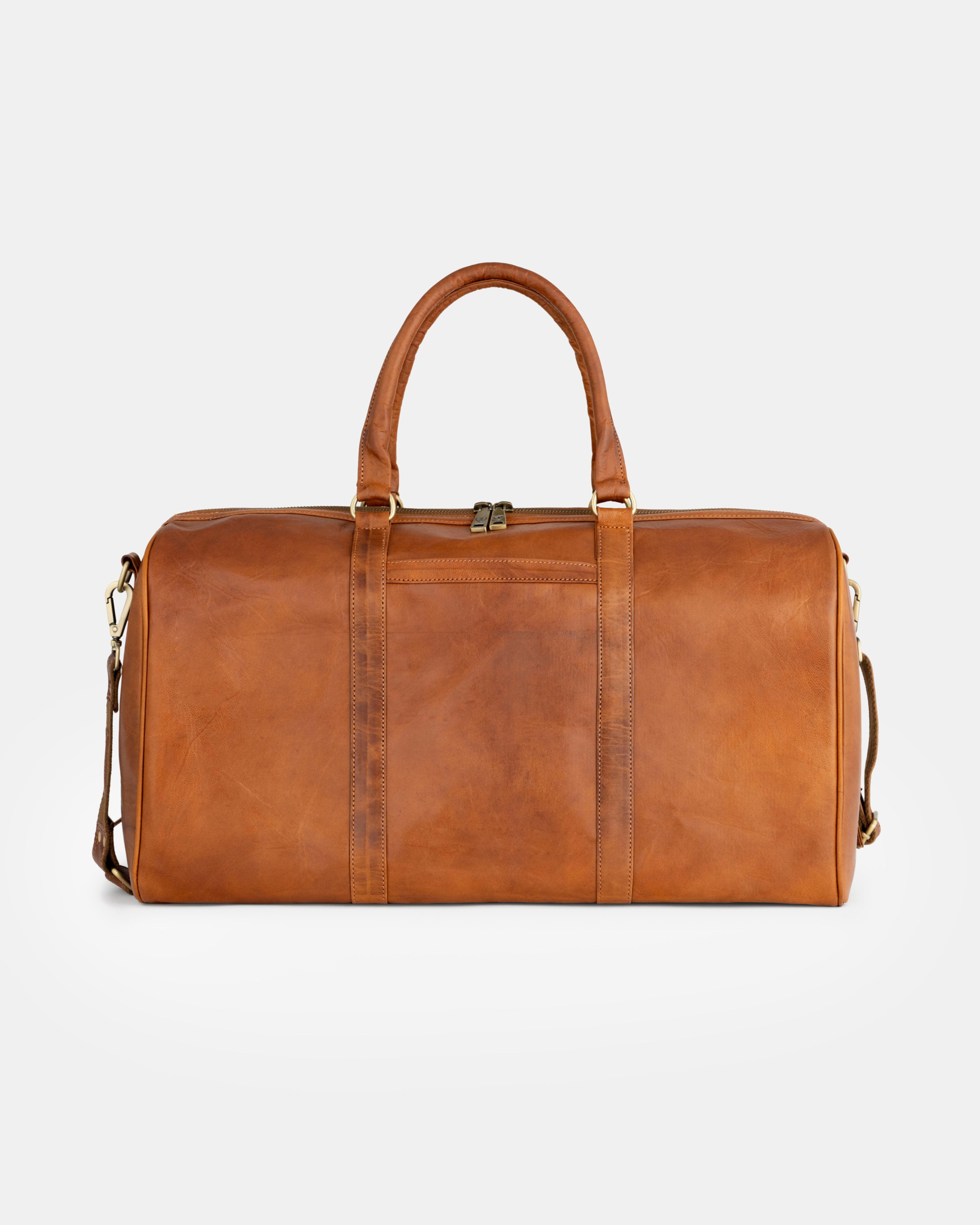 Meet Boston!This vintage travel bag is designed for durability and crafted from durable vegetable-tanned goat leather, ensuring long-lasting quality. The spacious main compartments, along with the smart organization features like the zipped inside pocket and pen/card holders, offer convenient storage options and additionally a water resistant pouch and luggage tag. This travel companion showcases individuality with unique distressing and a distinctive color, making it perfect for any adventure.