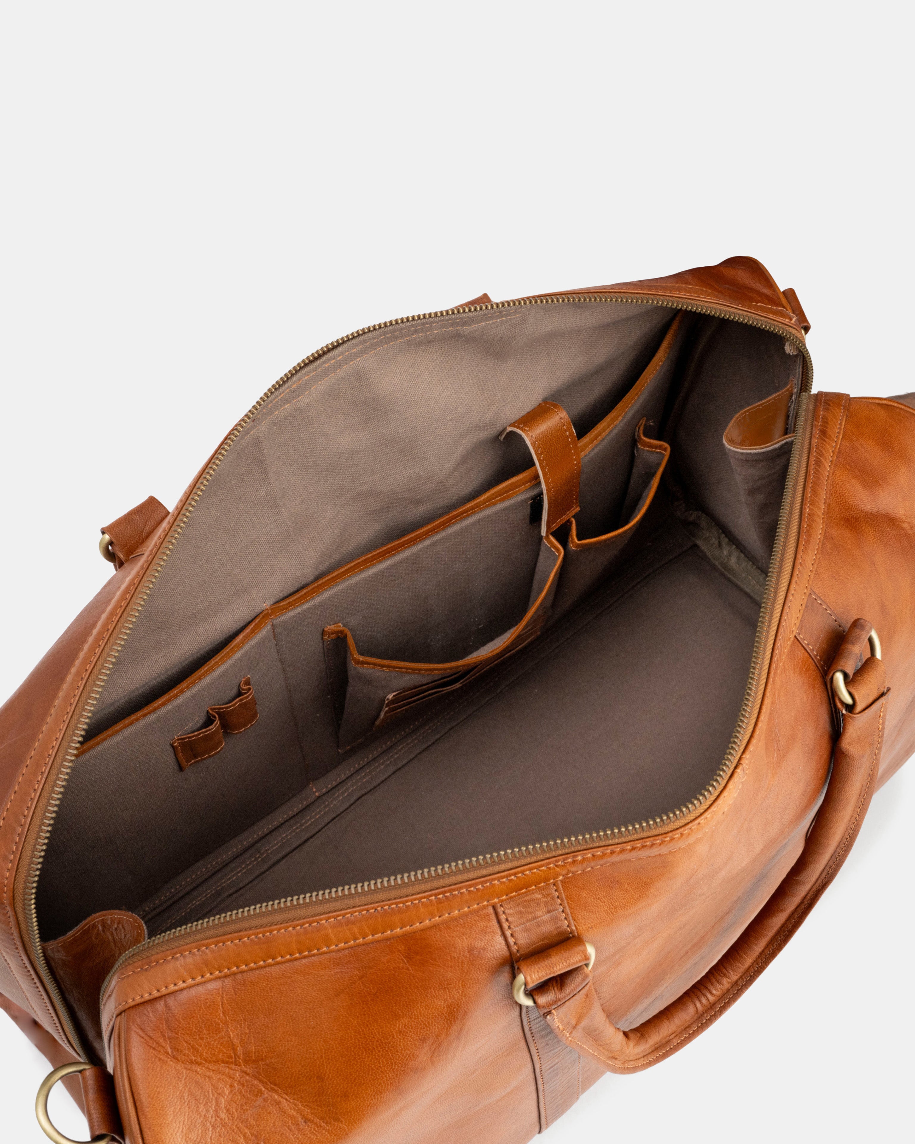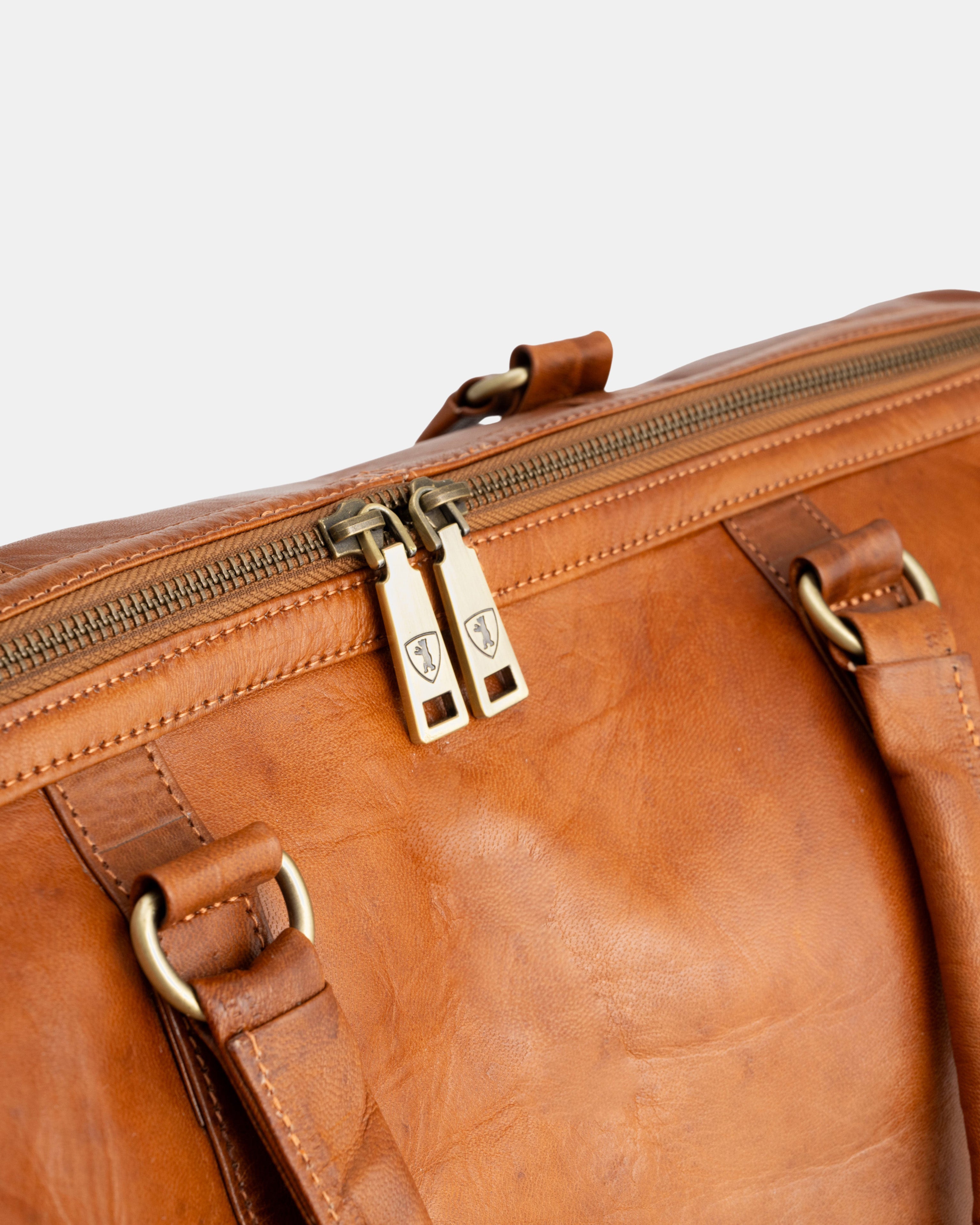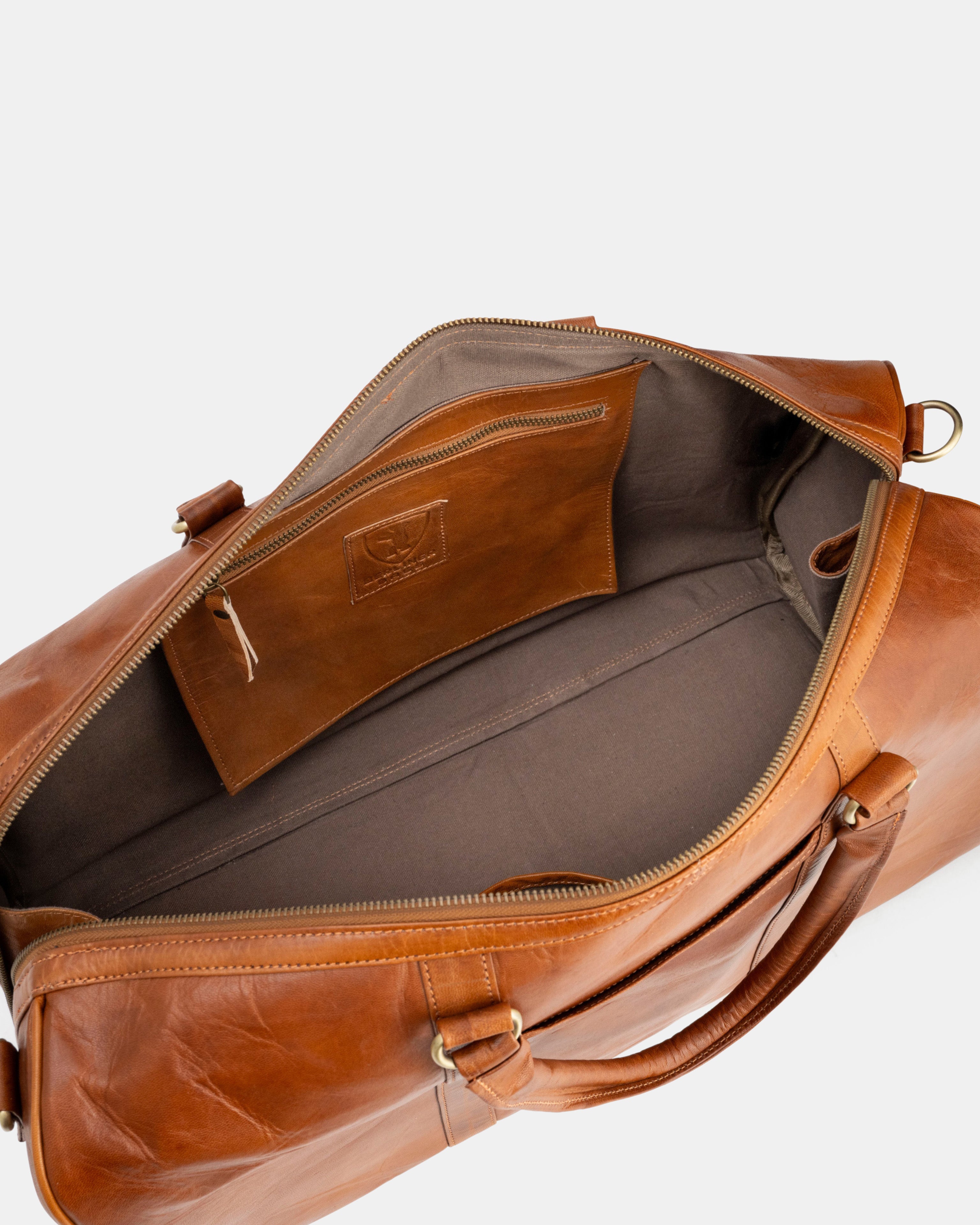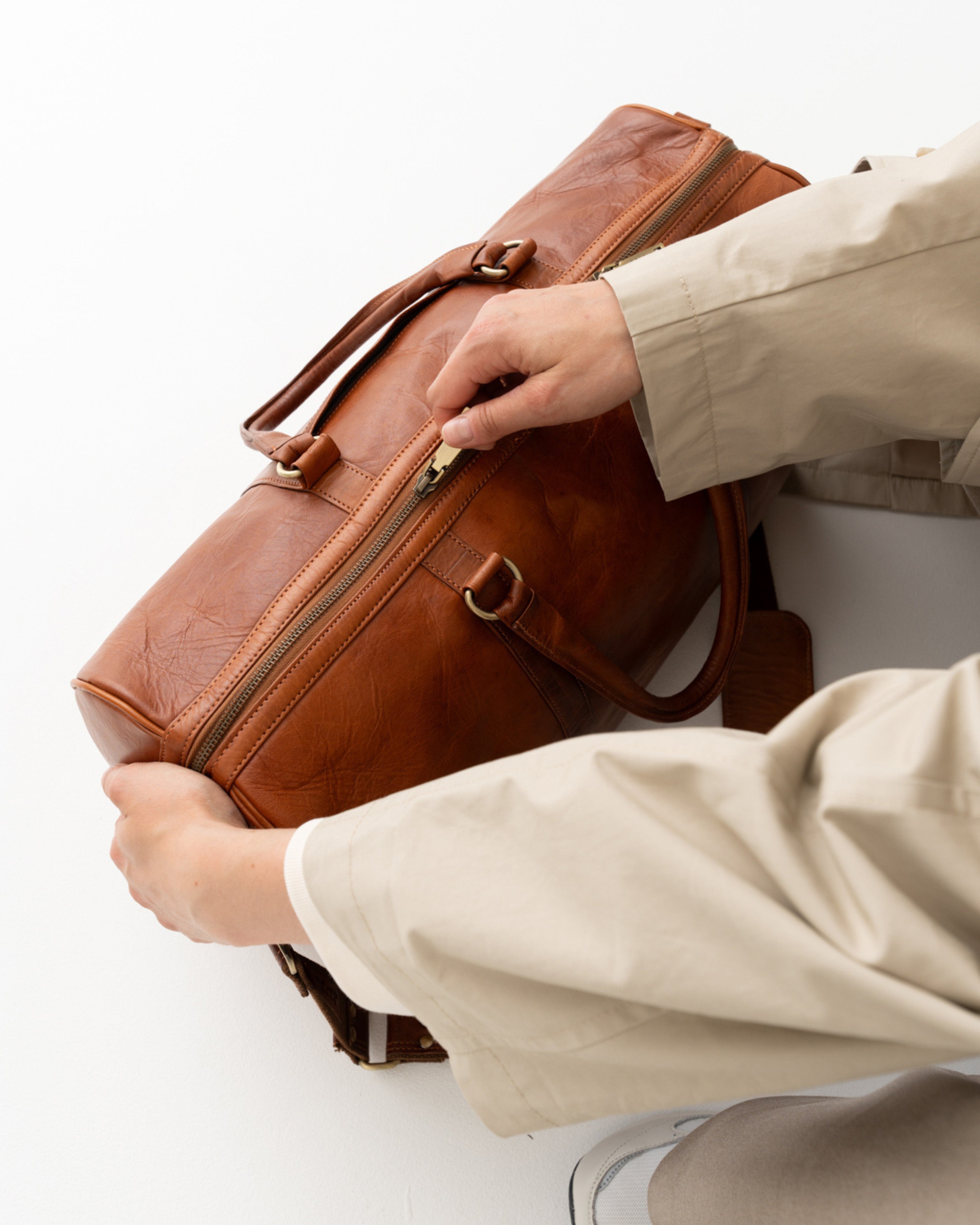 Meet Boston!This vintage travel bag is designed for durability and crafted from durable vegetable-tanned goat leather, ensuring long-lasting quality. The spacious main compartments, along with the smart organization features like the zipped inside pocket and pen/card holders, offer convenient storage options and additionally a water resistant pouch and luggage tag. This travel companion showcases individuality with unique distressing and a distinctive color, making it perfect for any adventure.