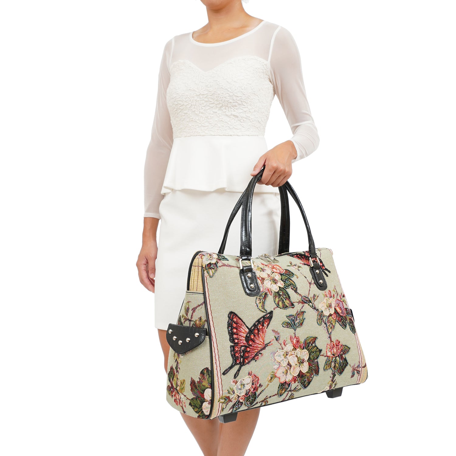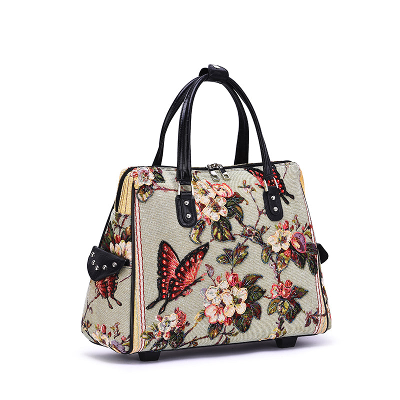 Vintage butterfly hand beaded rolling carry-on laptop carrier.