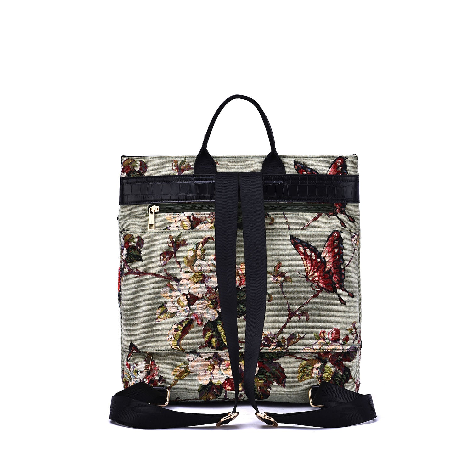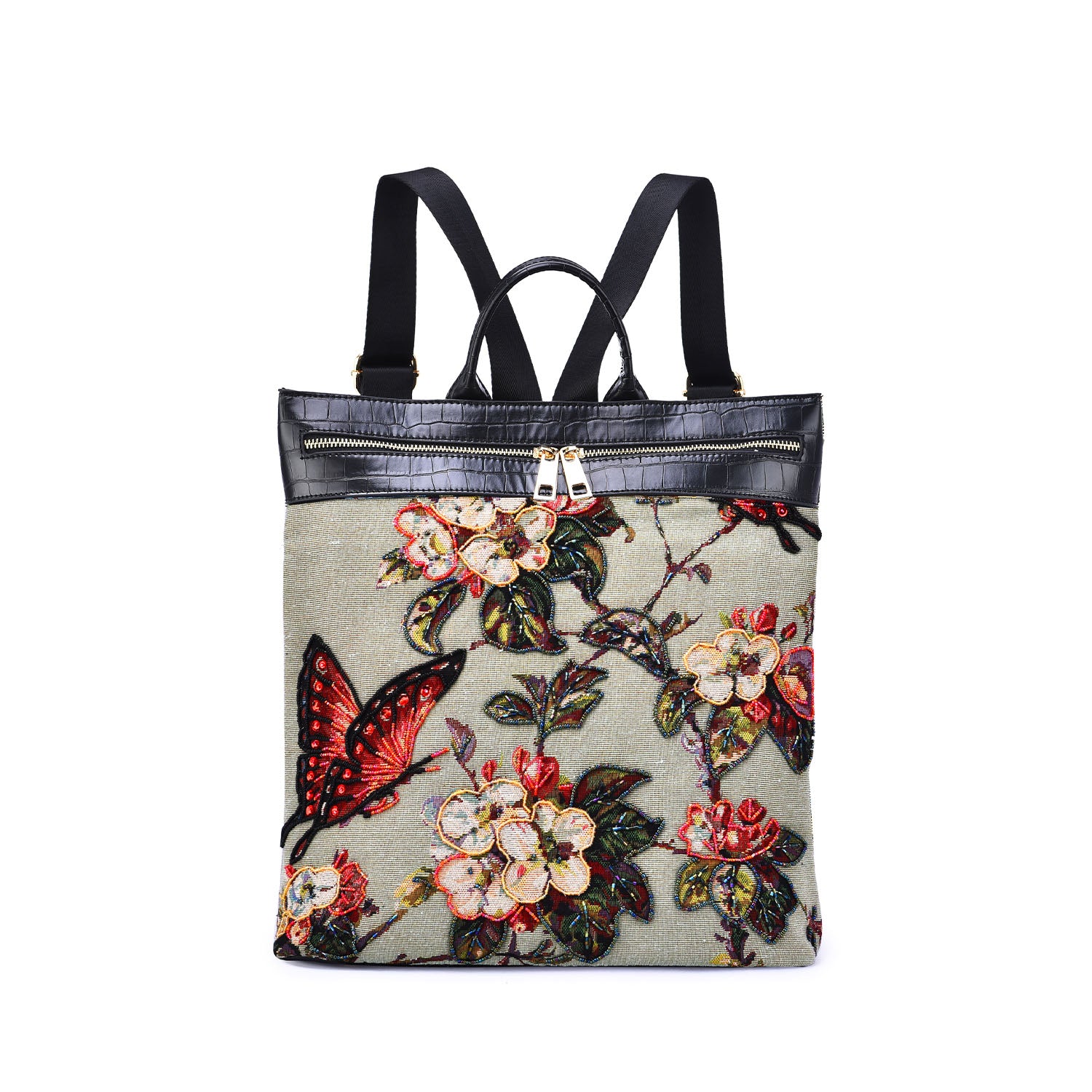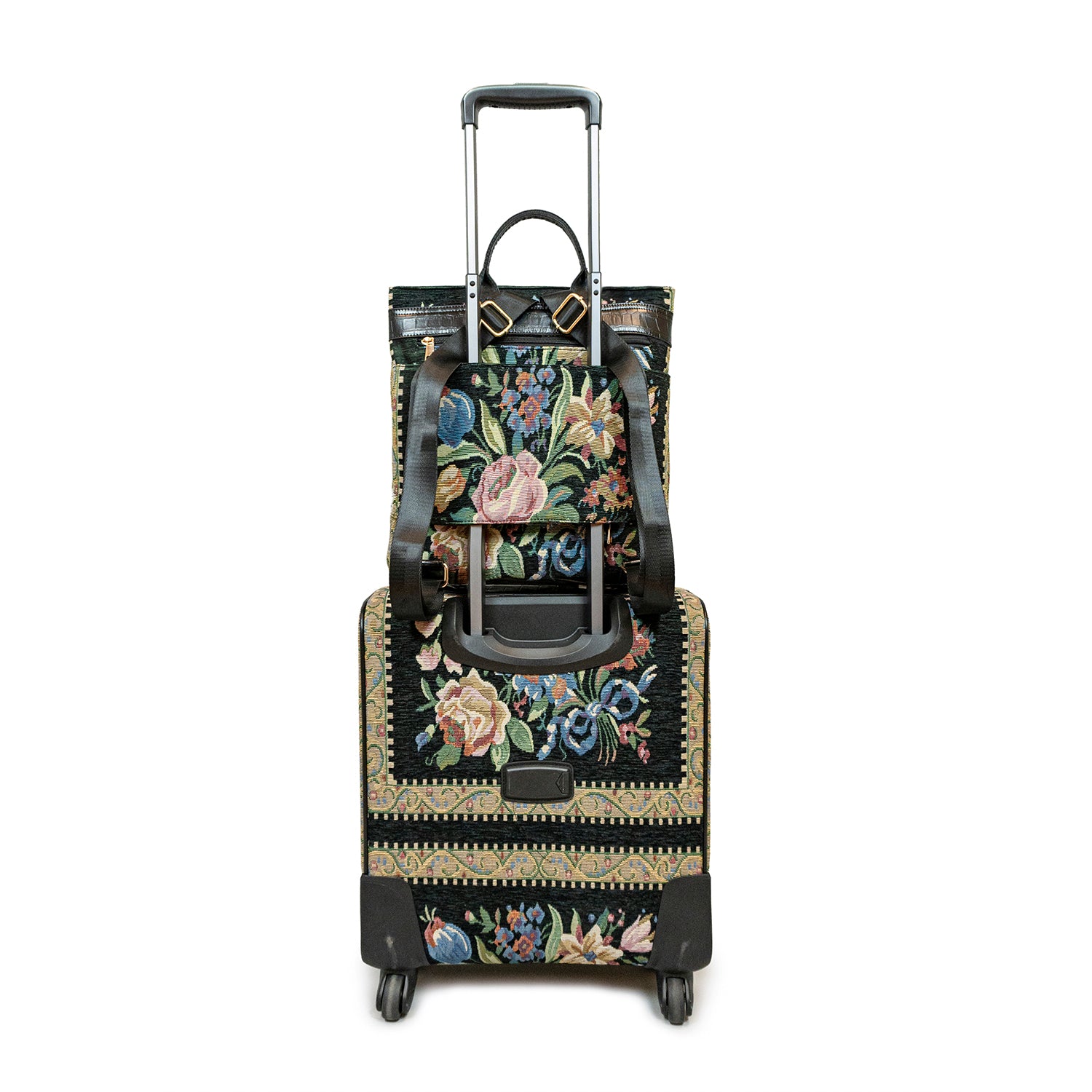 Flower Shop hand-beaded floral backpack with luggage sleeve on back.