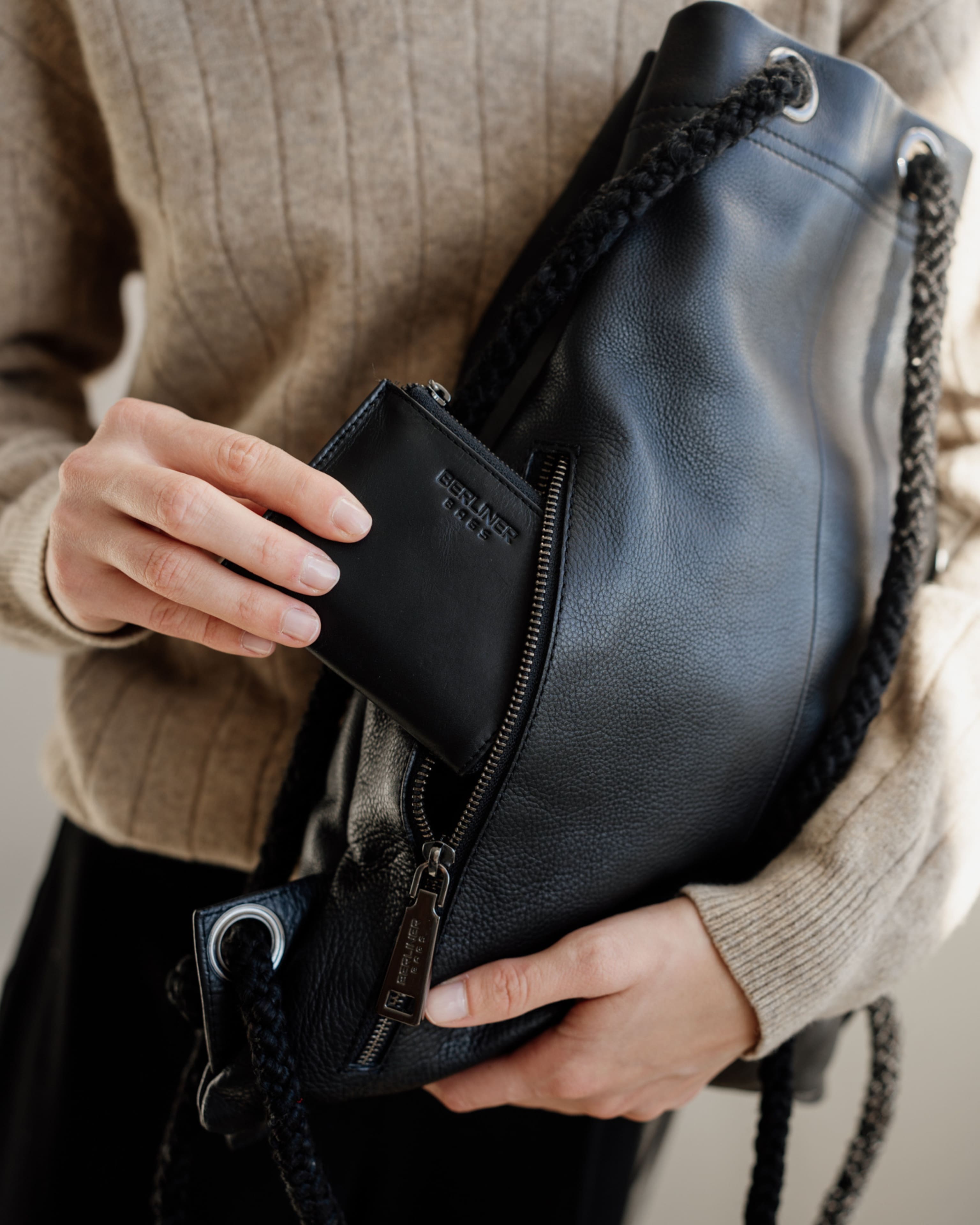 Meet Gym Bag! This drawstring sports bag is ideal for hitting the gym or as a casual daypack. This backpack is the perfect combination of casual design and high quality materials. Gym Bag features a handy internal zippered pocket and key ring, to keep your most important items at hand. Adjust the shoulder straps by knotting the sturdy gotten cords. Choose between vintage brown and premium black options.