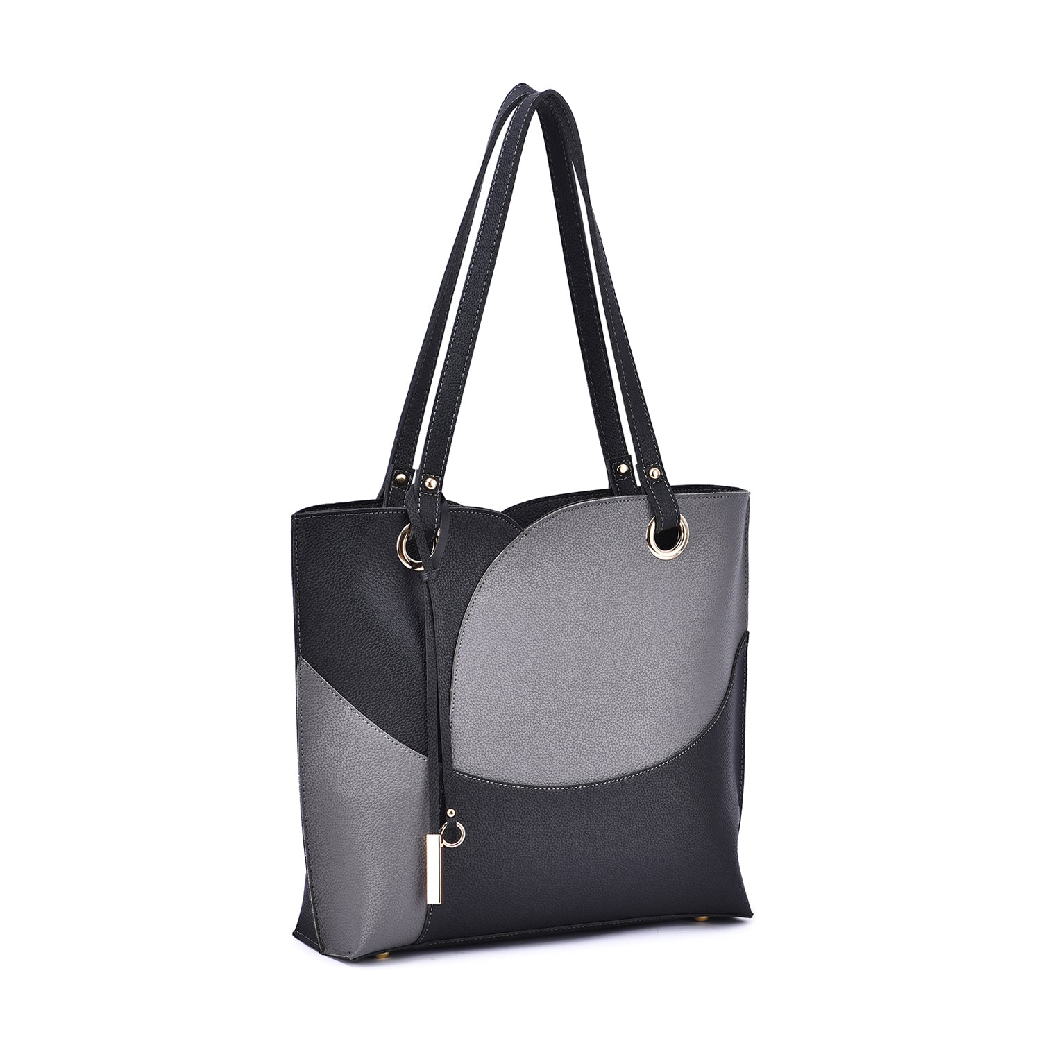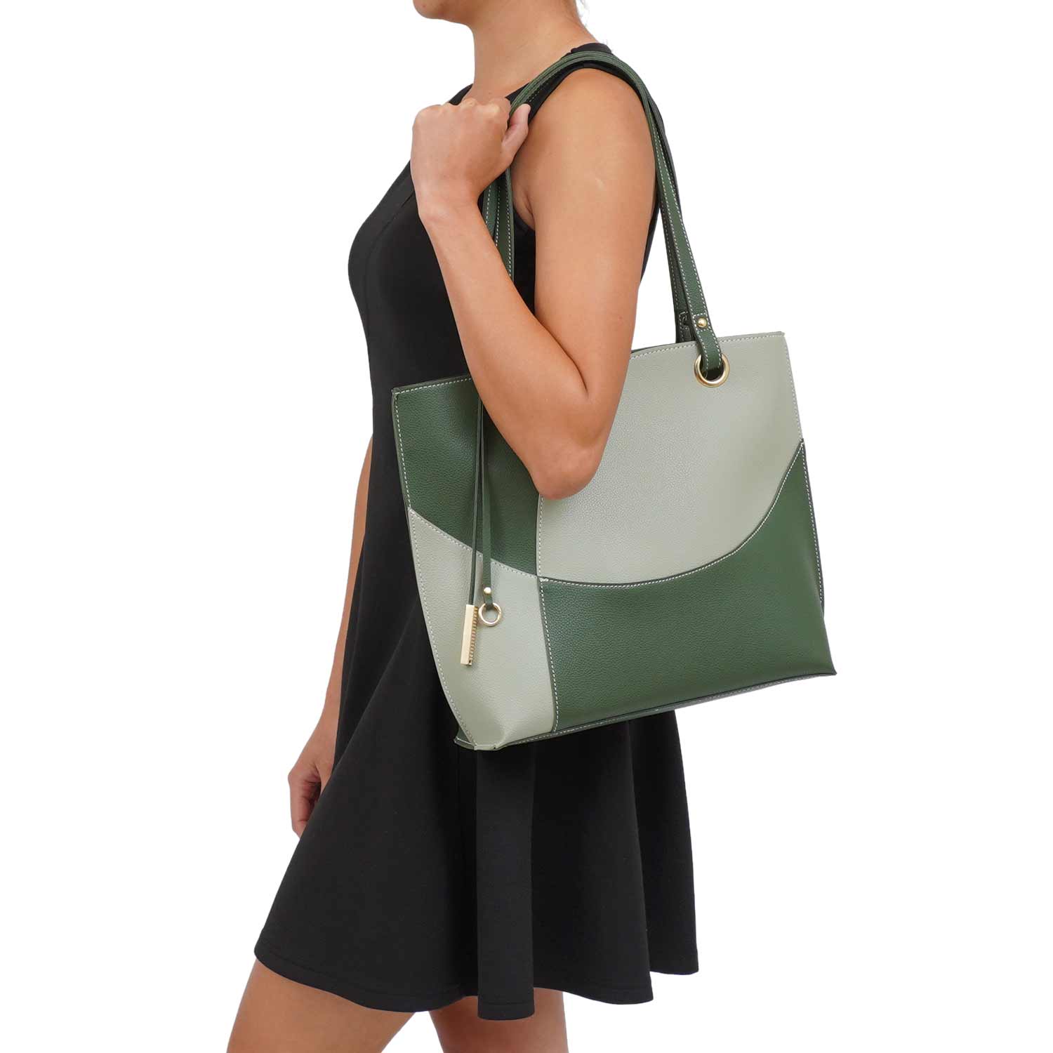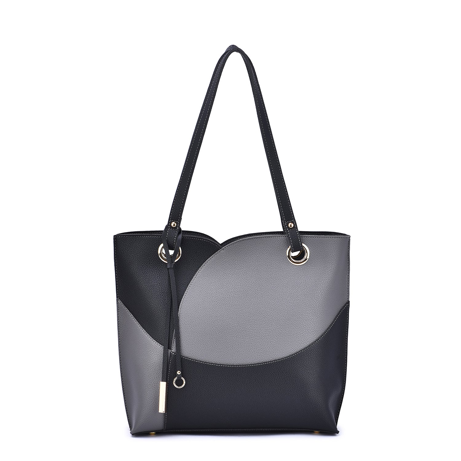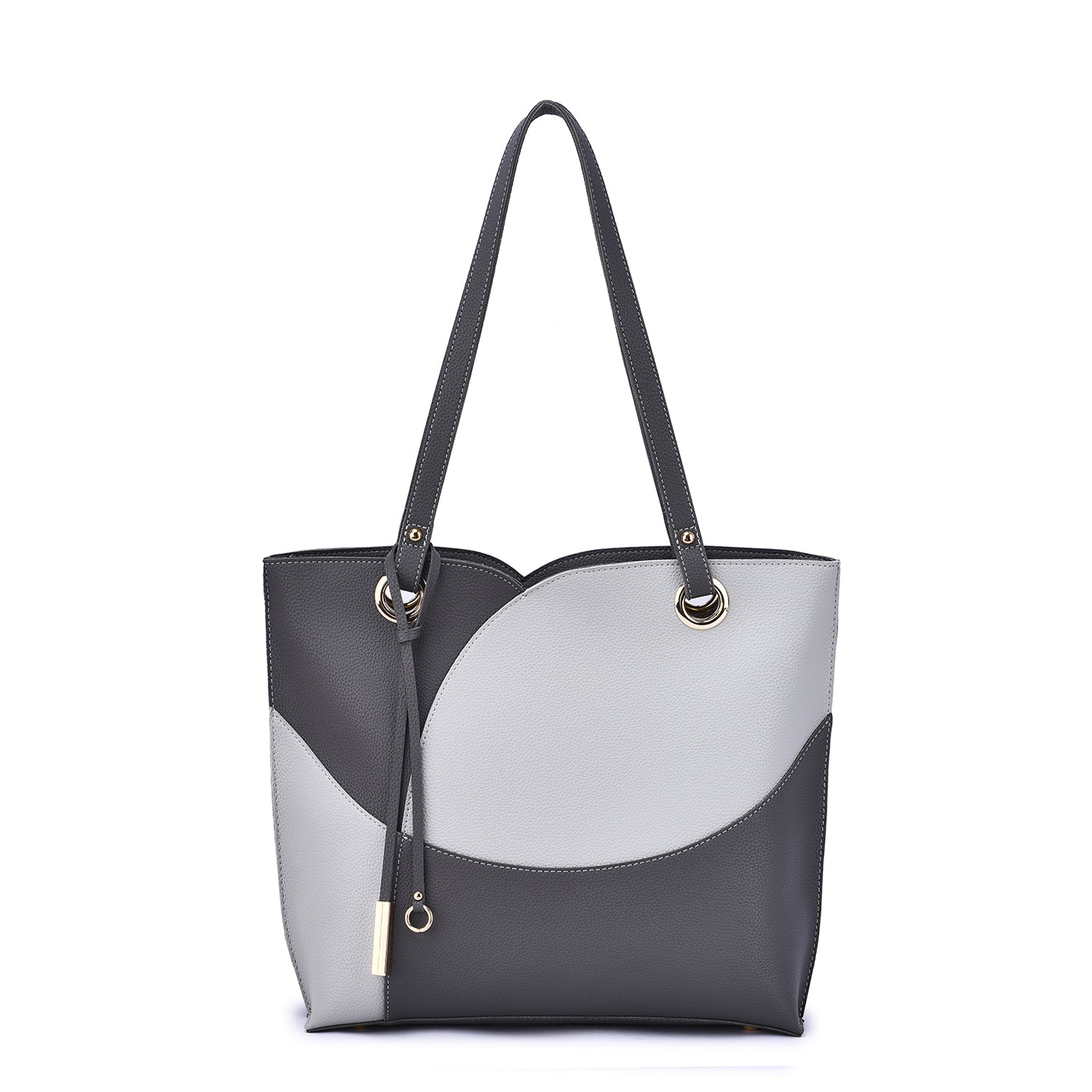 Itzel off-center dip, color block tote with metal accented tassel.