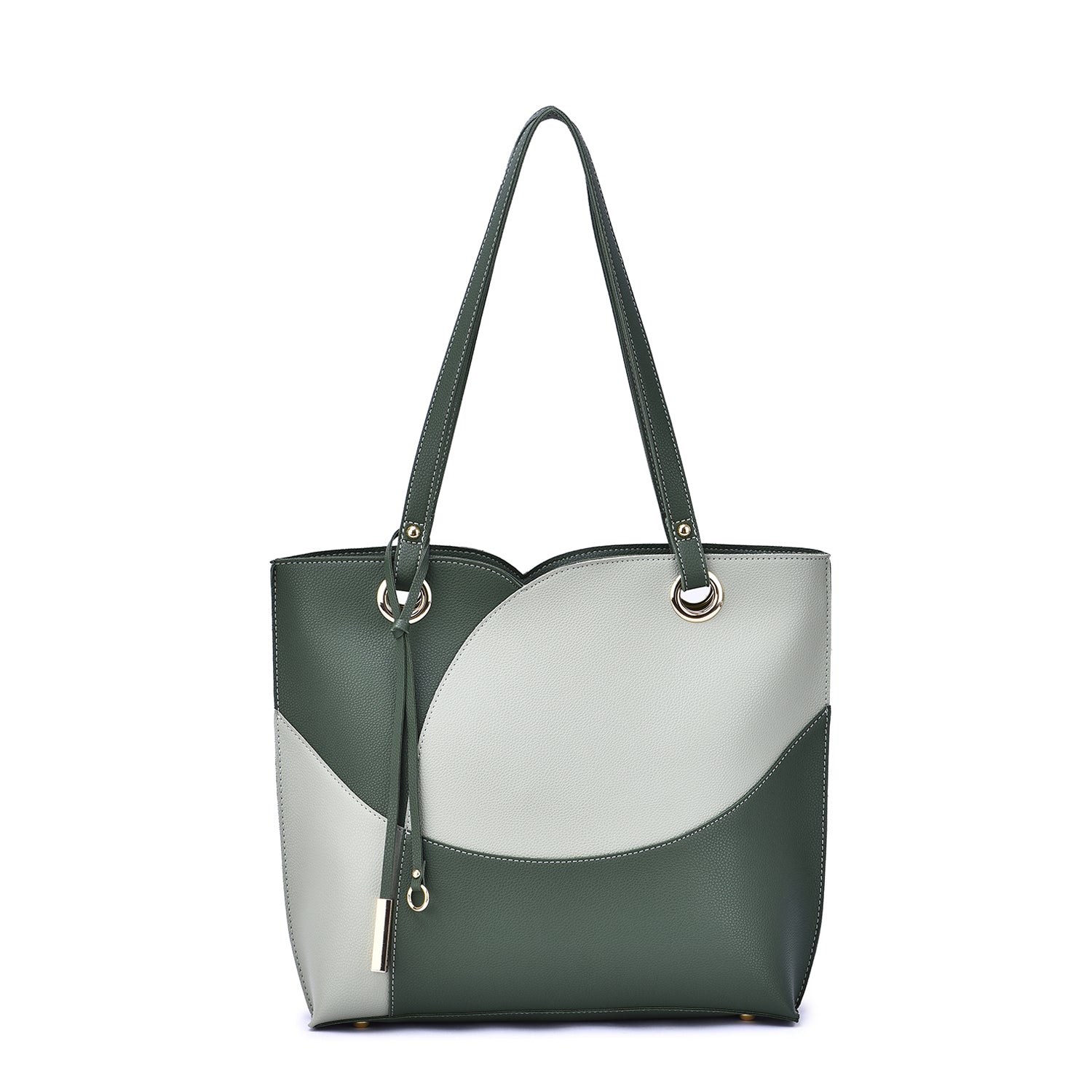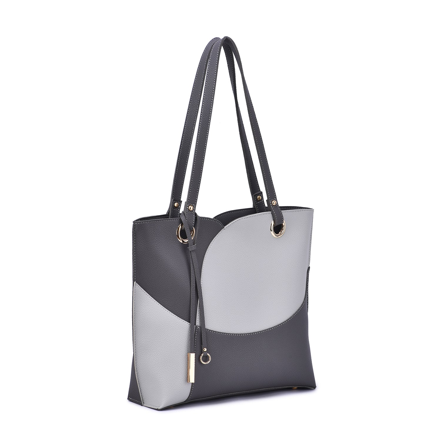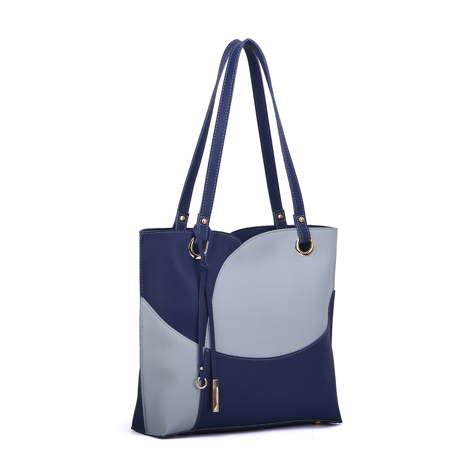 Itzel off-center dip, color block tote with metal accented tassel.