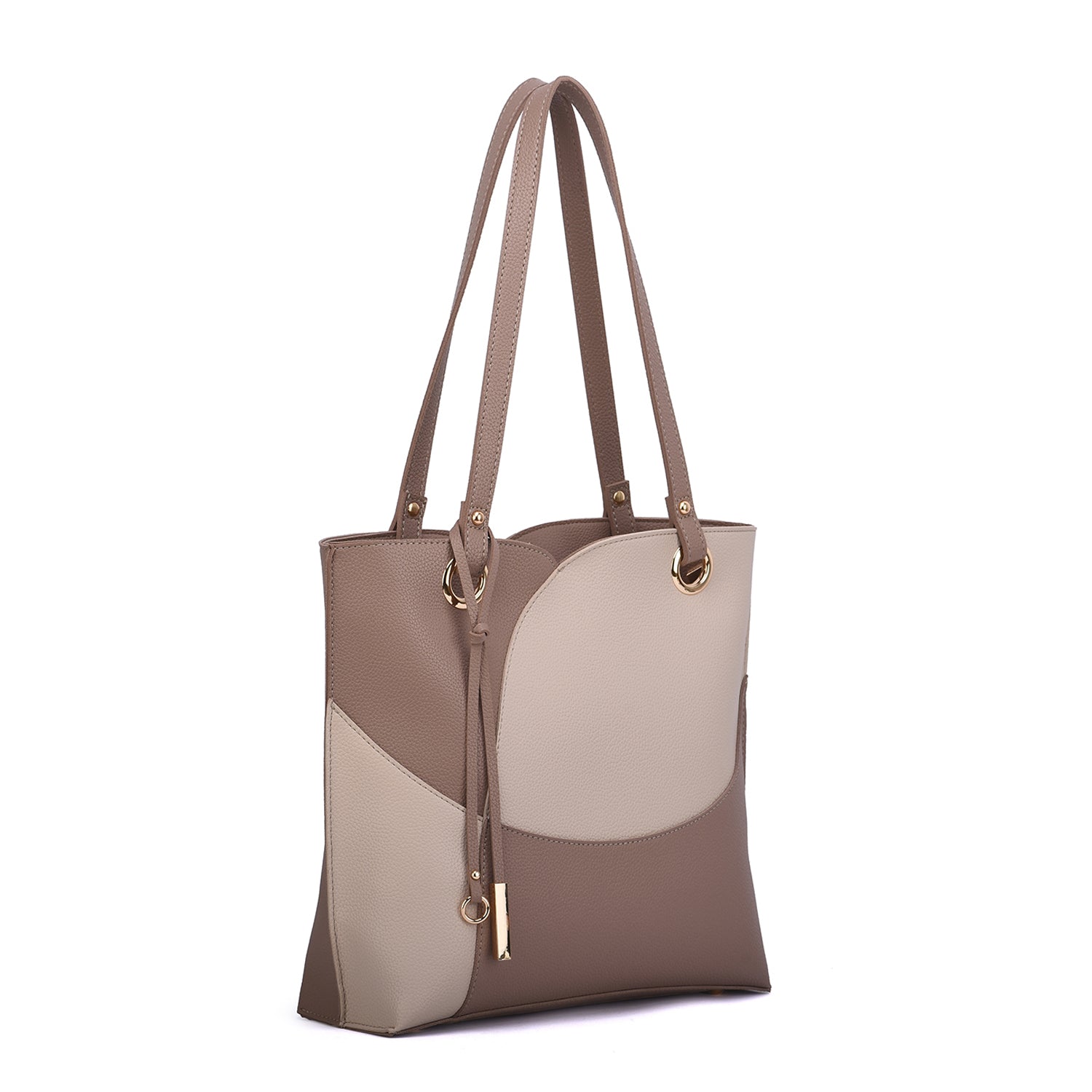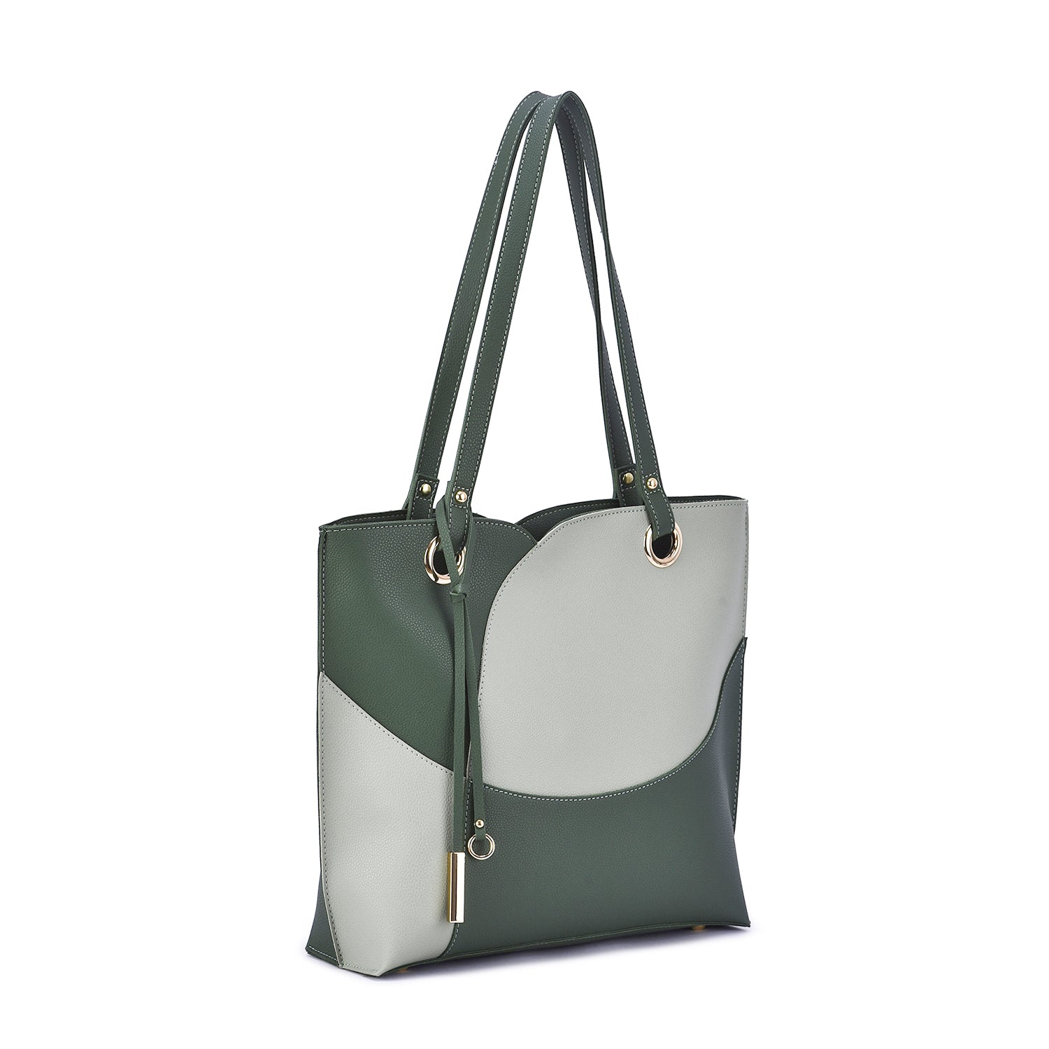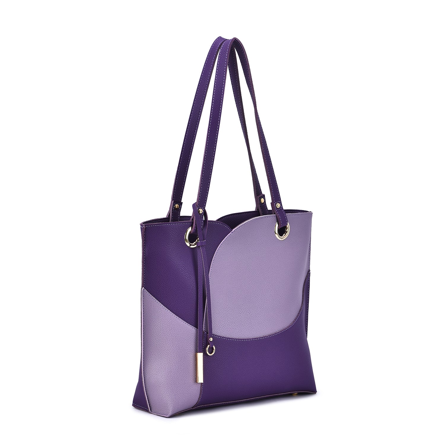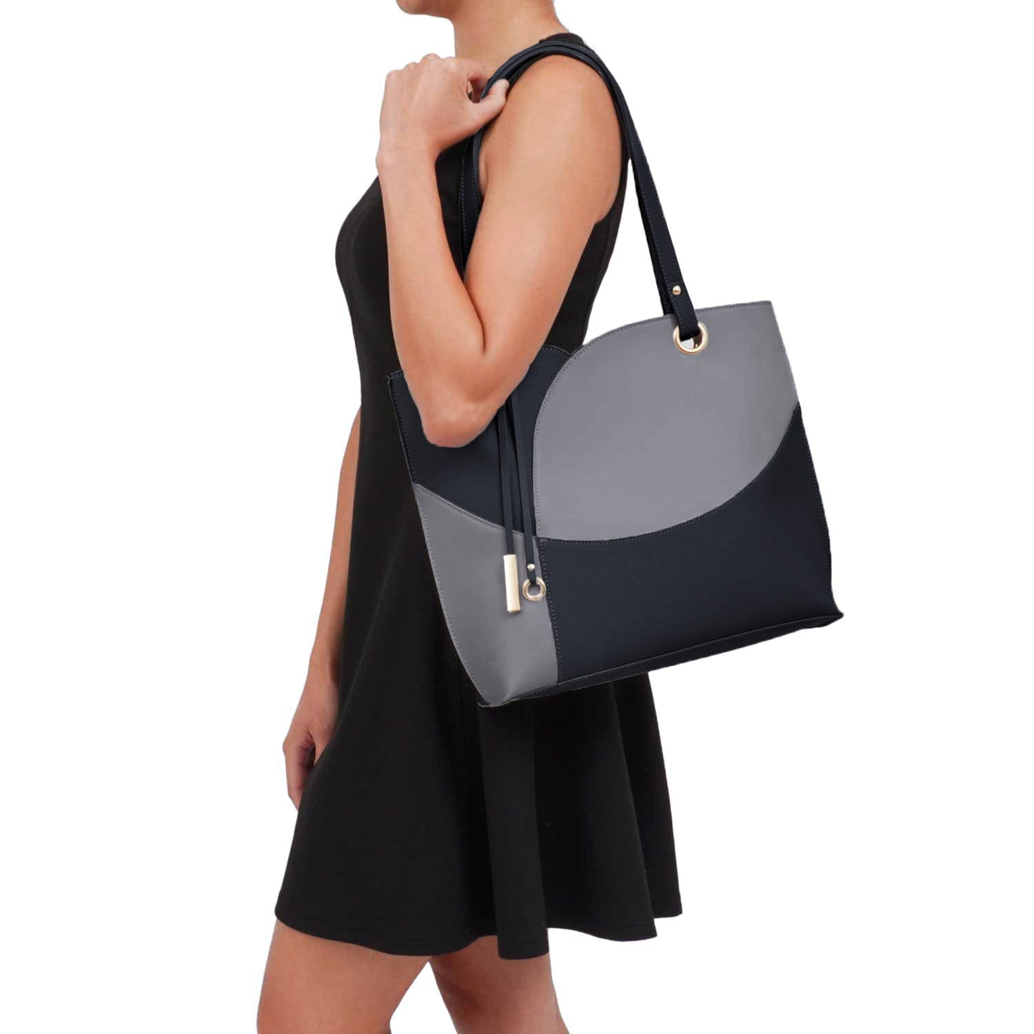 Itzel off-center dip, color block tote with metal accented tassel.