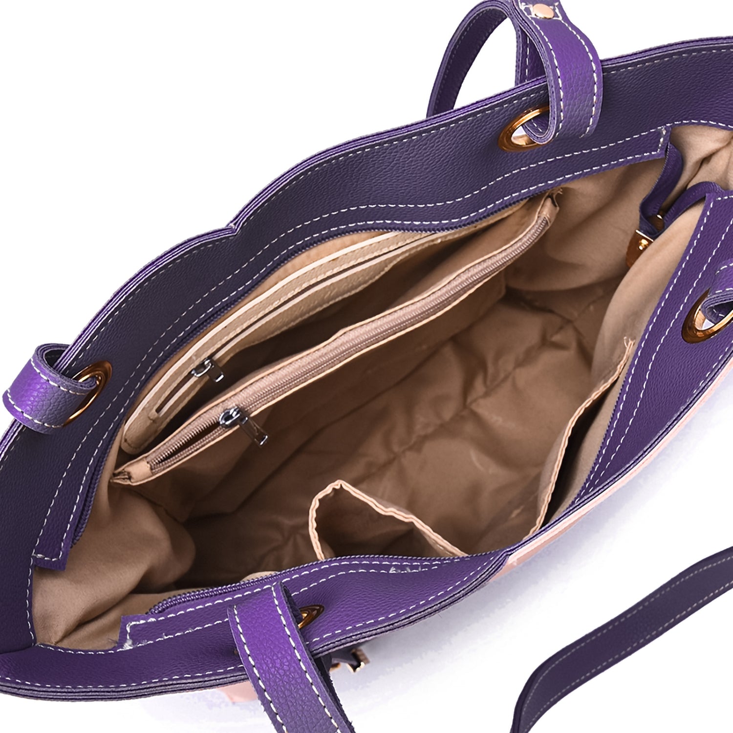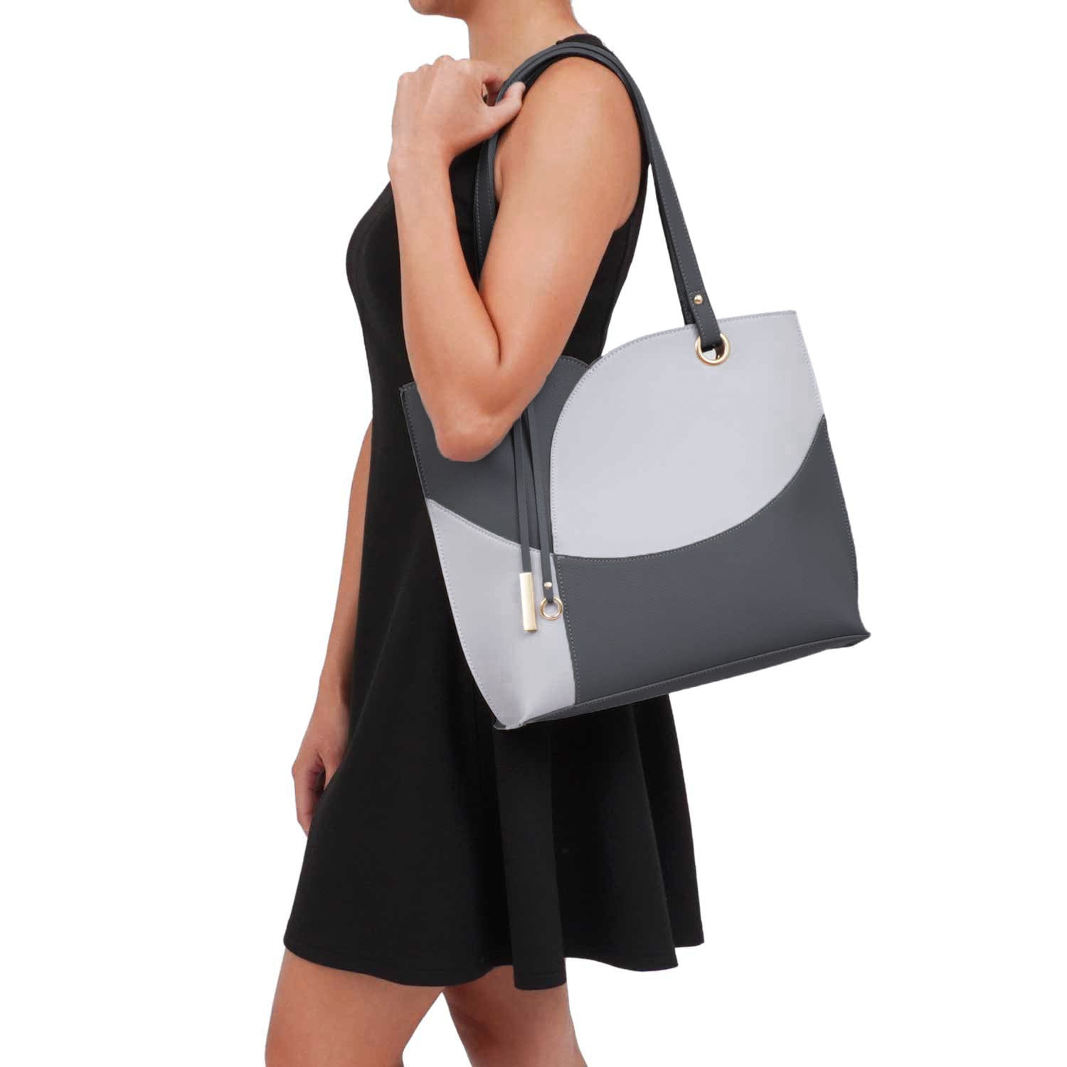 Your browser does not support our video. Itzel off-center dip, color block tote with metal accented tassel. Product Details: Primary Closure Type: Zipper Measurements: 15″W x 12″H x 4″D Interior: 2 zipper pockets, 2 slip pockets Care: Spot clean 100% Vegan leather