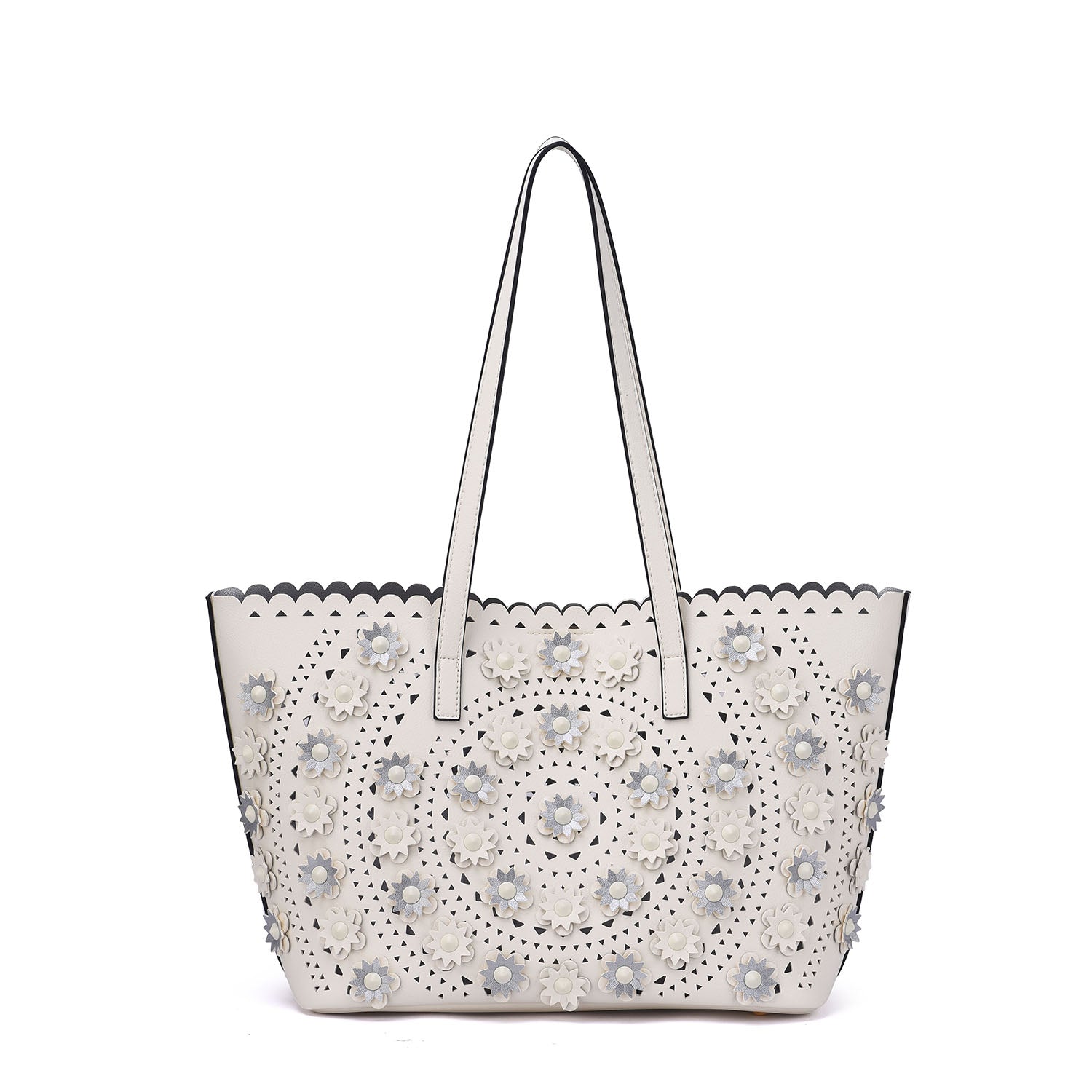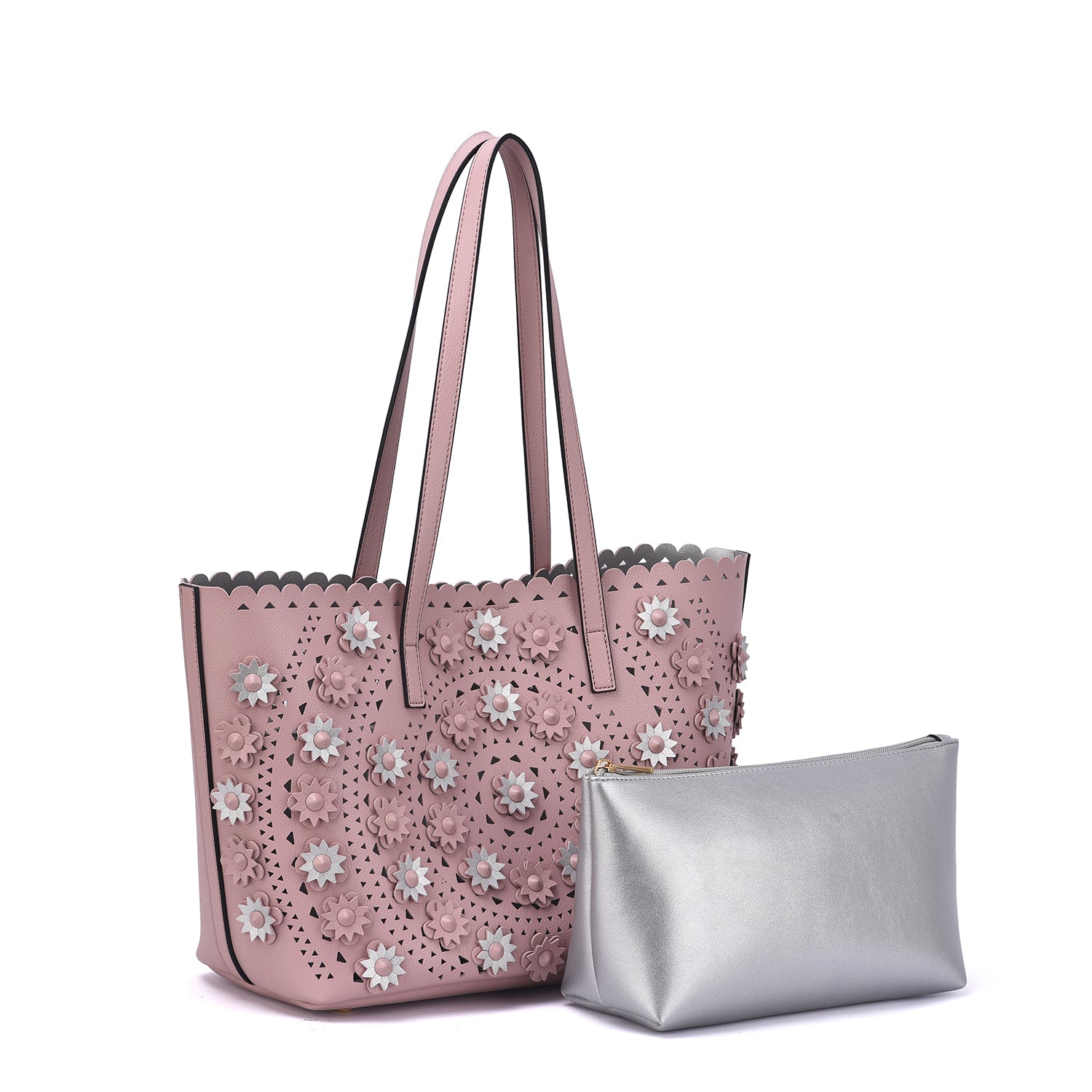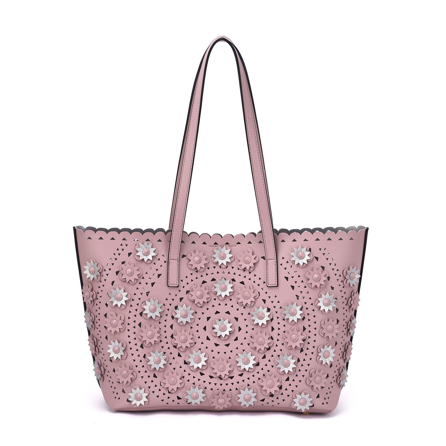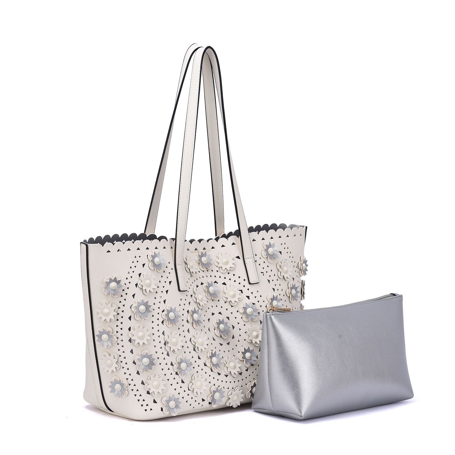 A lovely perforated tote with 3D floral design and an interior pouch to keep all your personal belongs organized.Â