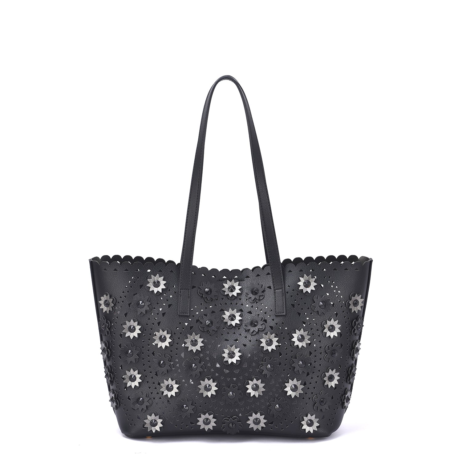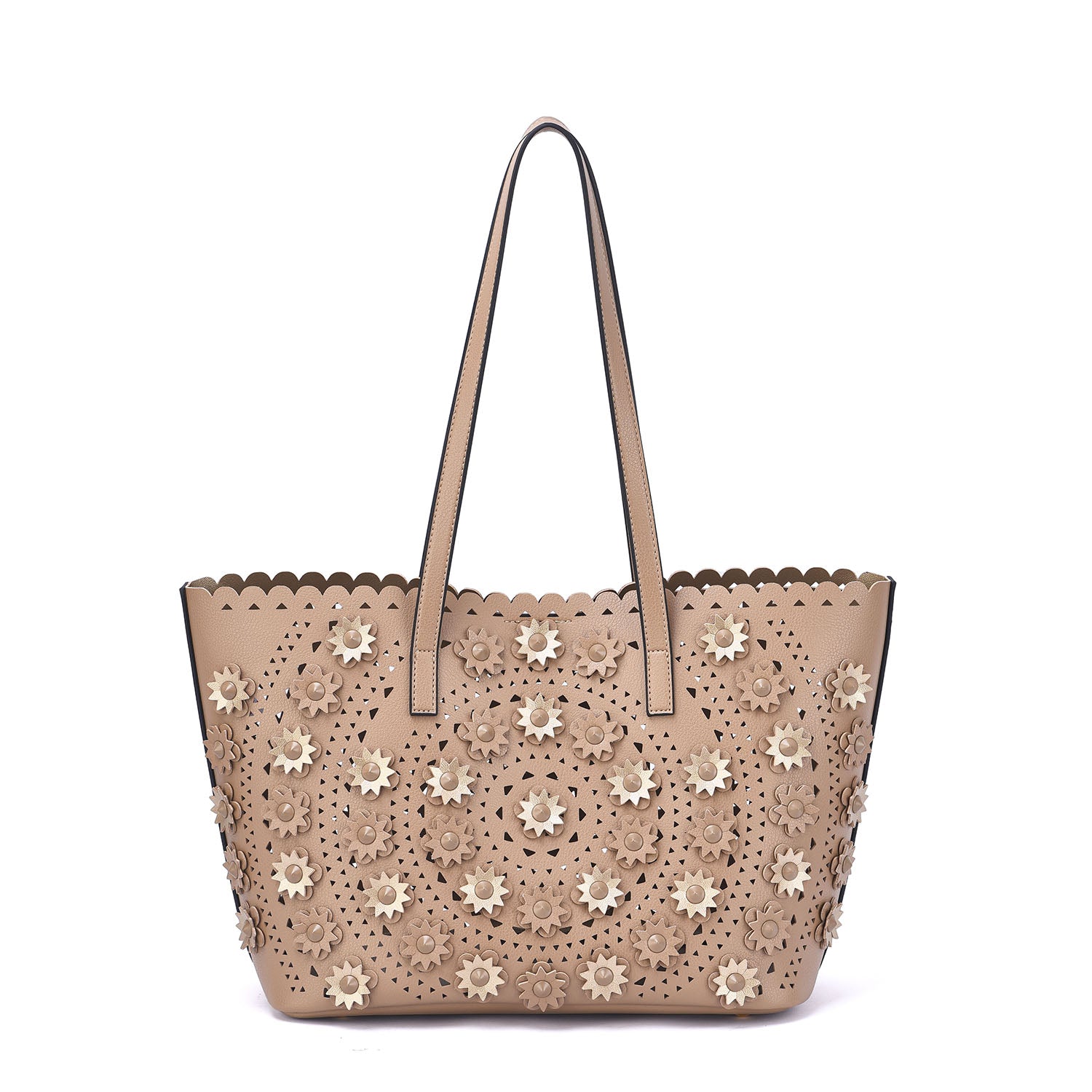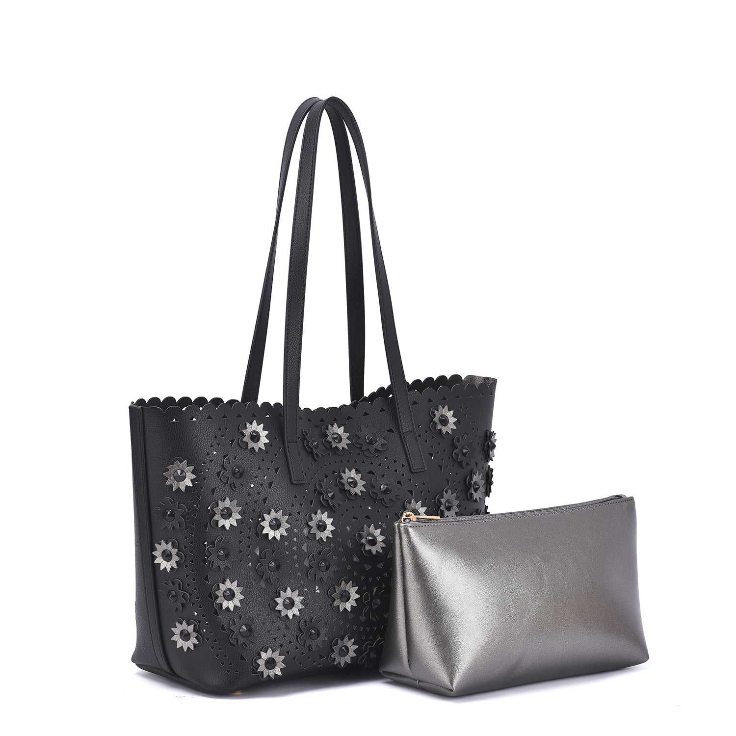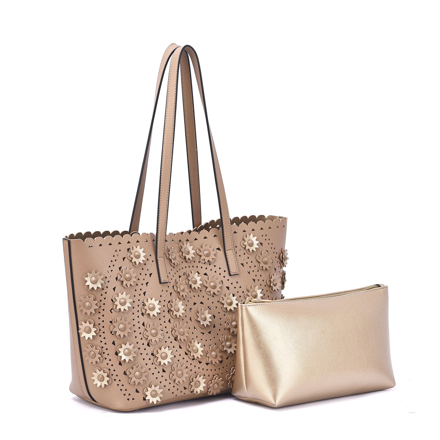 A lovely perforated tote with 3D floral design and an interior pouch to keep all your personal belongs organized.Â