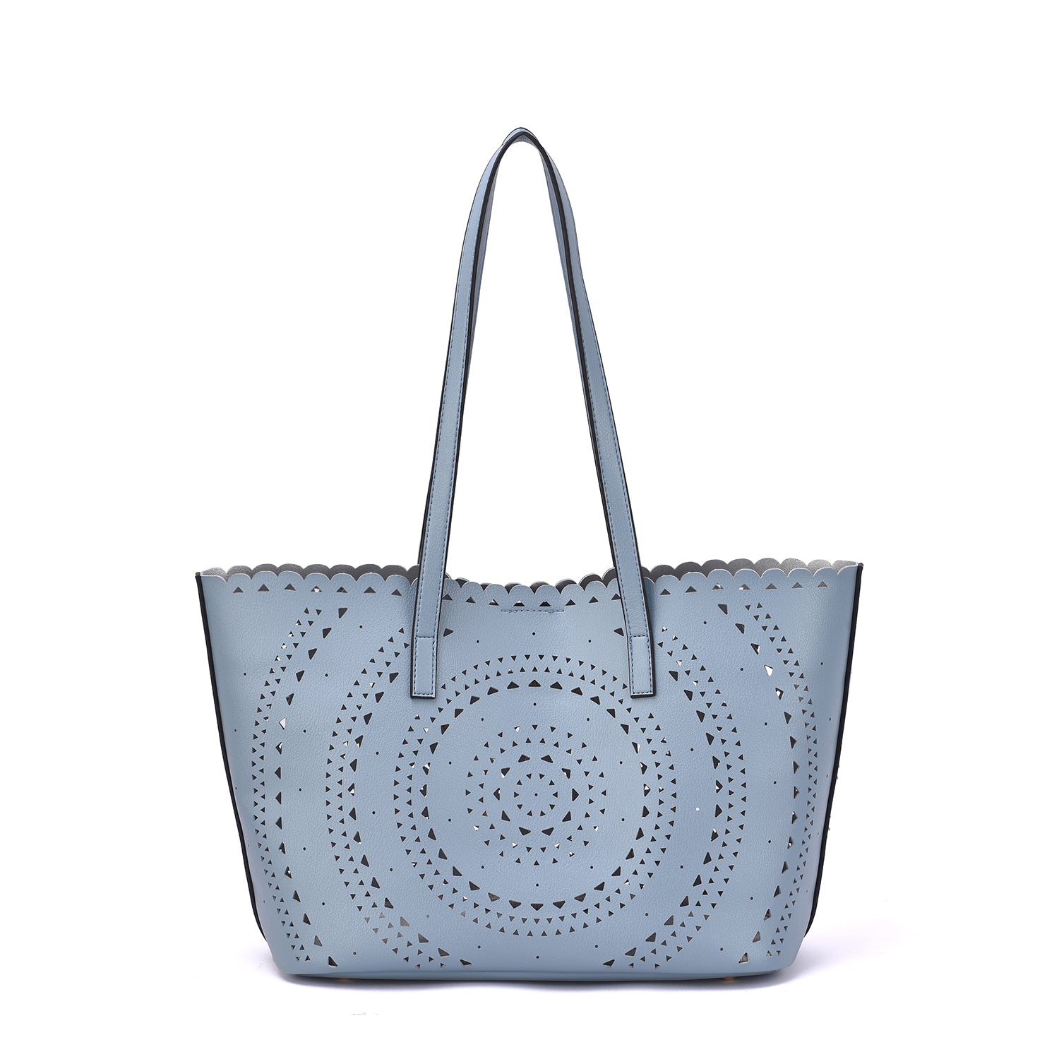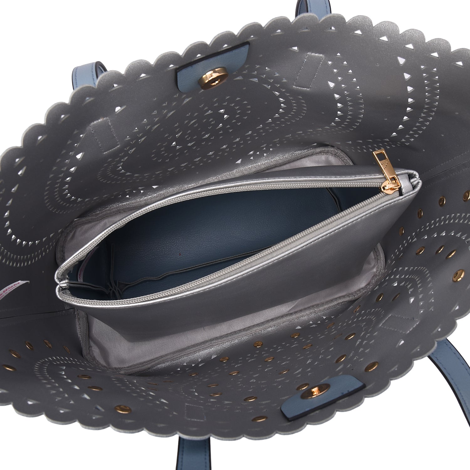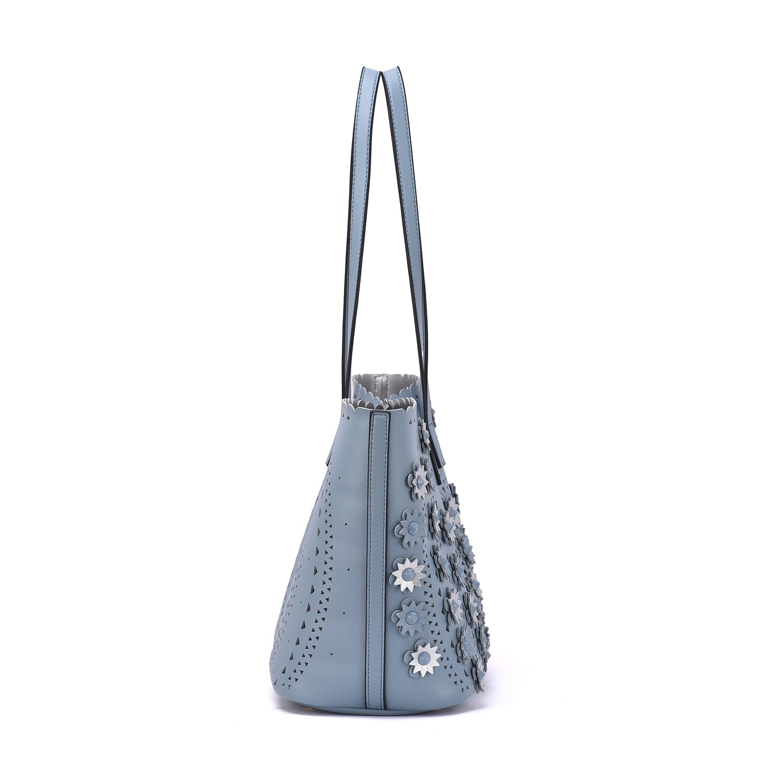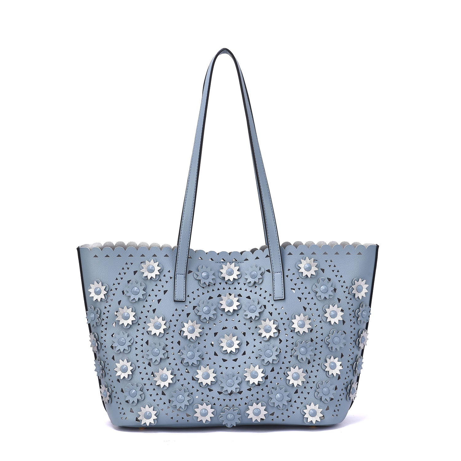 A lovely perforated tote with 3D floral design and an interior pouch to keep all your personal belongs organized.Â