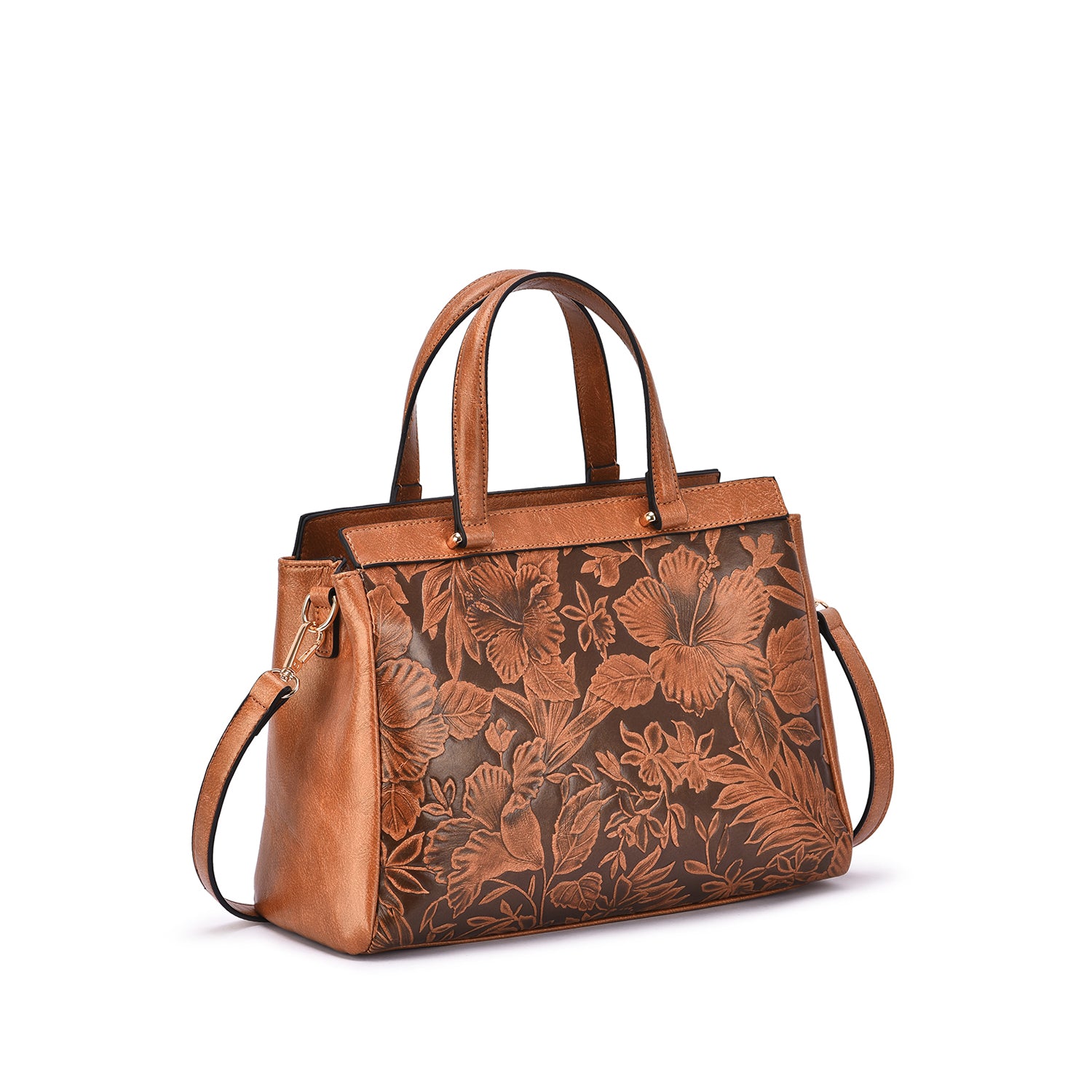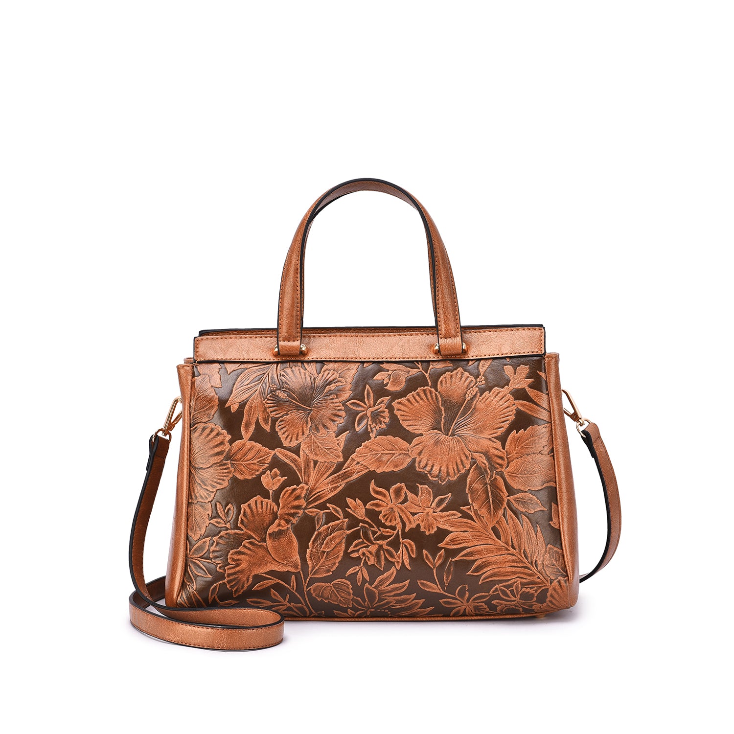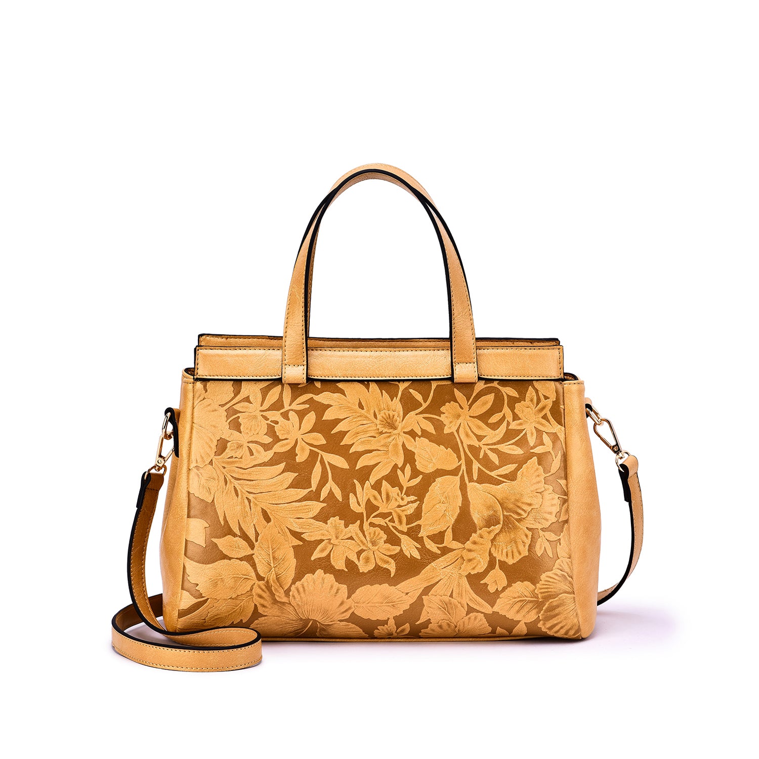 Contrast embossed floral motif adds vintage-chic appeal to a structured vegan leather satchel with a removable/adjustable crossbody strap.