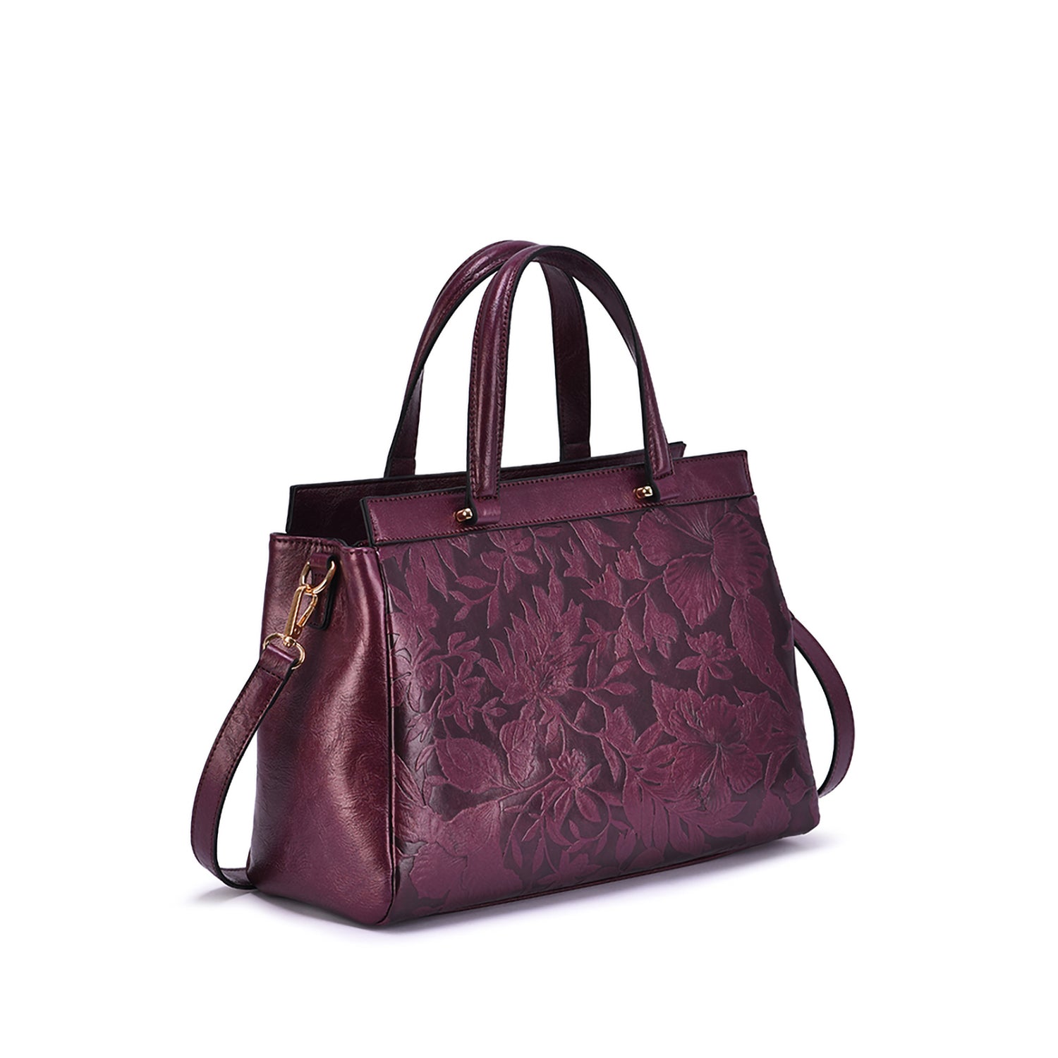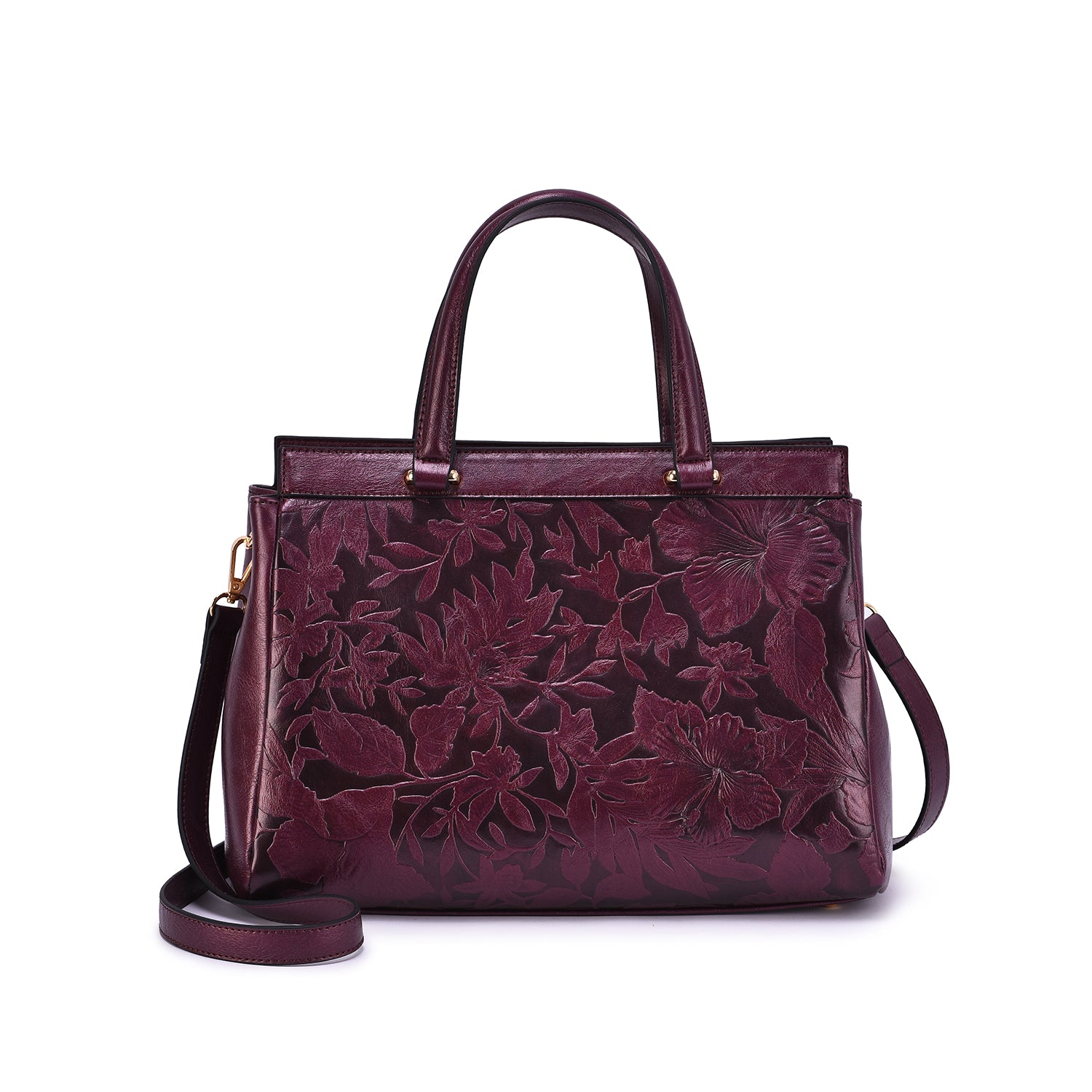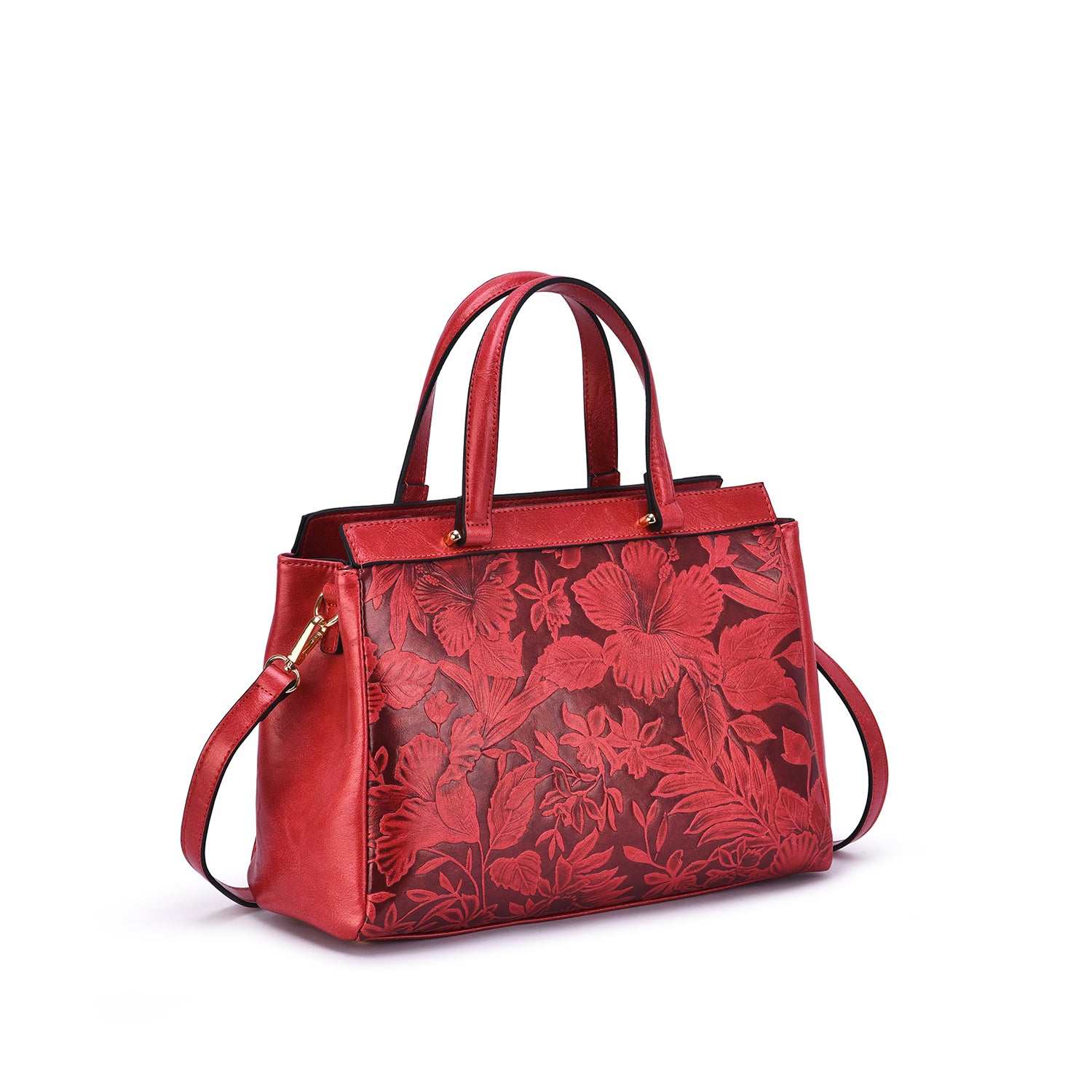Contrast embossed floral motif adds vintage-chic appeal to a structured vegan leather satchel with a removable/adjustable crossbody strap.